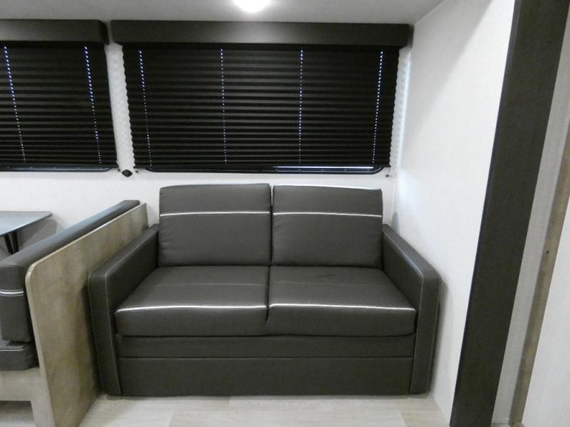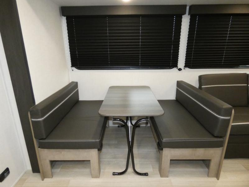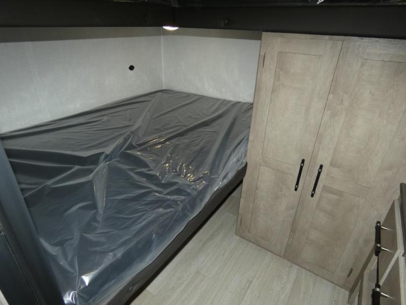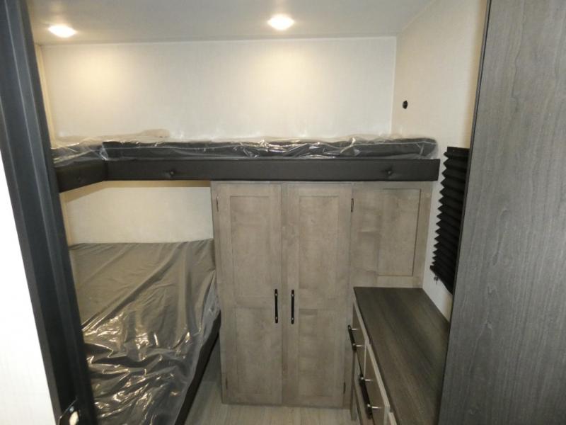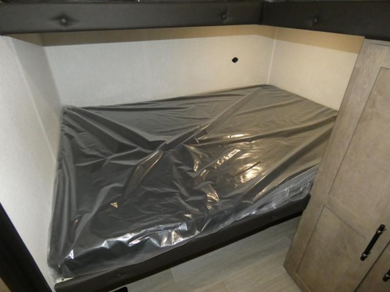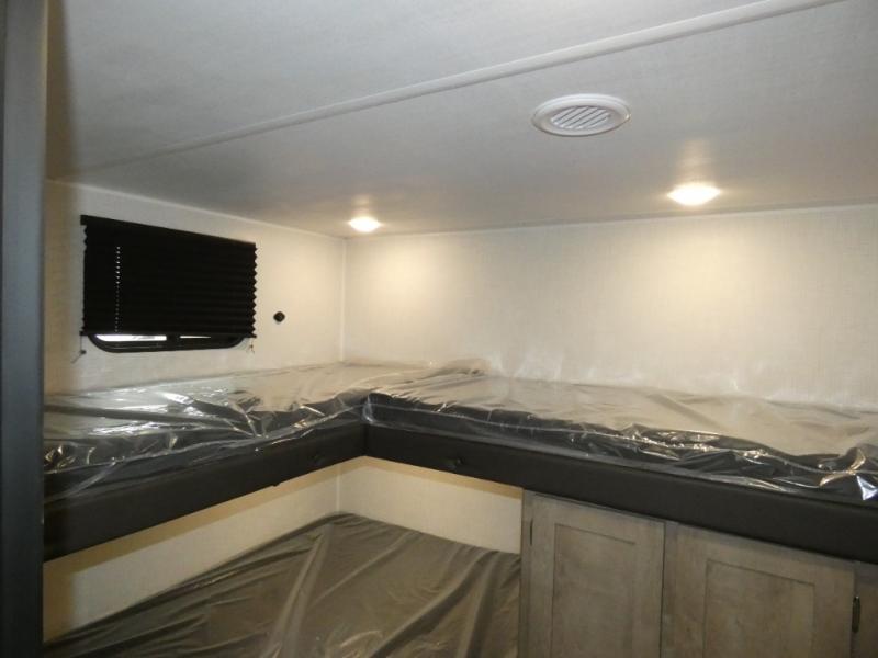 Camping with friends and family is easier than ever in this spacious trailer with a rear private bunkhouse! You'll find triple bunks in this room, along with two closets to keep everything tidy. The front private bedroom will feel just like home with its queen bed, plus dual closets and dual nightstands. Your crew can all gather in the main living area to relax on the sofa or play a game at the booth dinette, and there is even TV prep in this room if you enjoy movie nights. Head outdoors to relax under the 16' power awning.