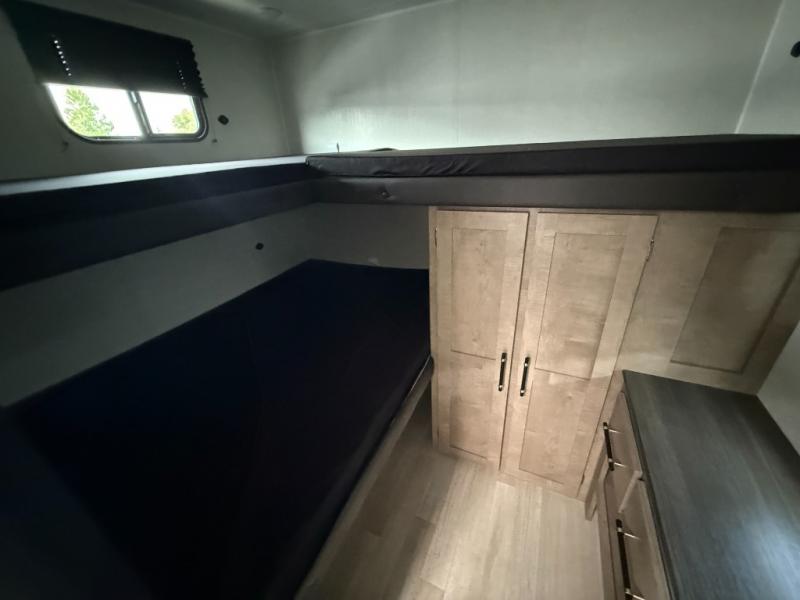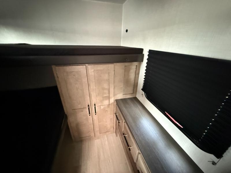 Camping with friends and family is easier than ever in this spacious trailer with a rear private bunkhouse! You'll find triple bunks in this room, along with a dresser and closet to keep everything tidy. The front private bedroom will feel just like home with its queen bed, plus dual closets and dual nightstands. Your crew can all gather in the main living area to relax on the sofa or play a game at the booth dinette, and there is even TV prep in this room if you enjoy movie nights. Head outdoors to relax under the 16' power awning.