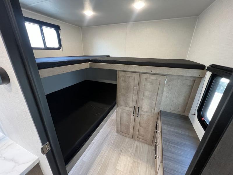Camping with friends and family is easier than ever in this spacious trailer with a rear private bunkhouse! You'll find triple bunks in this room, along with a dresser and closet to keep everything tidy. The front private bedroom will feel just like home with its queen bed, plus dual closets and dual nightstands. Your crew can all gather in the main living area to relax on the sofa or play a game at the booth dinette, and there is even TV prep in this room if you enjoy movie nights. Head outdoors to relax under the 16' power awning.
