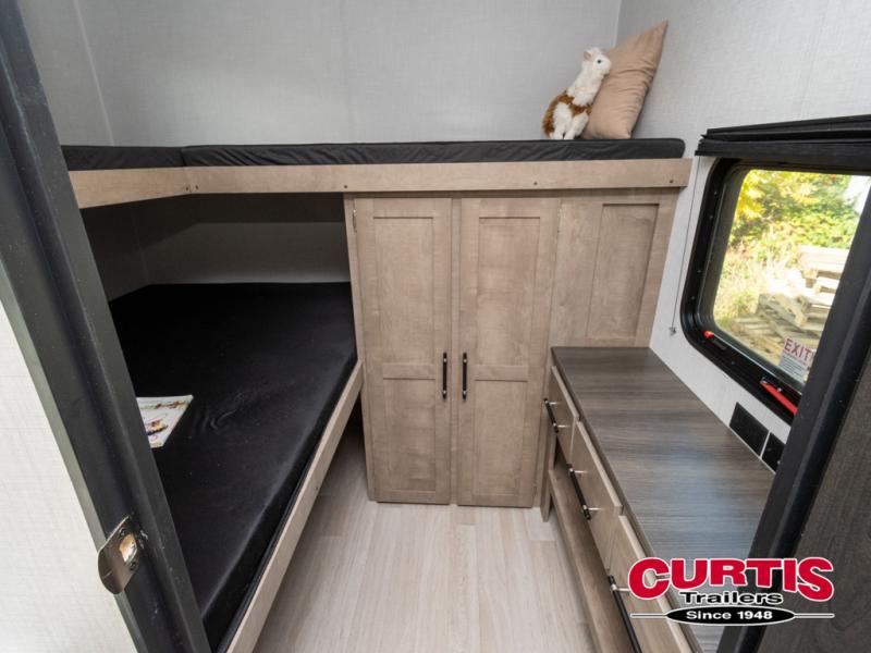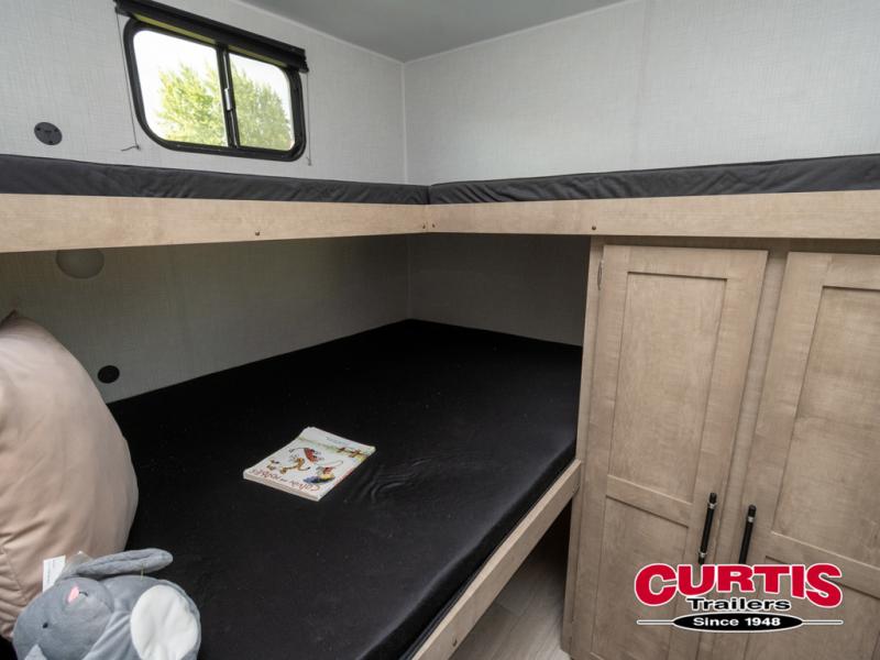 Camping with friends and family is easier than ever in this spacious trailer with a rear private bunkhouse! You'll find triple bunks in this room, along with a dresser and closet to keep everything tidy. The front private bedroom will feel just like home with its queen bed, plus dual closets and dual nightstands. Your crew can all gather in the main living area to relax on the sofa or play a game at the booth dinette, and there is even TV prep in this room if you enjoy movie nights. Head outdoors to relax under the 16' power awning.