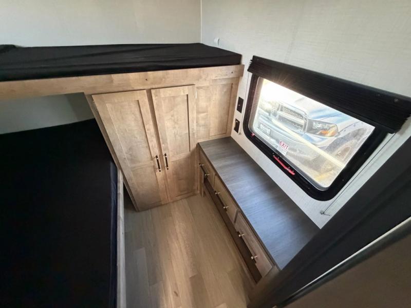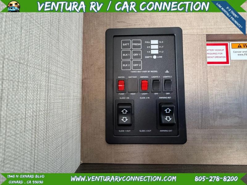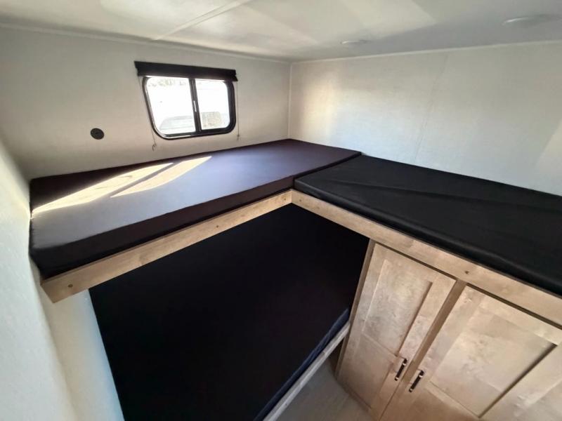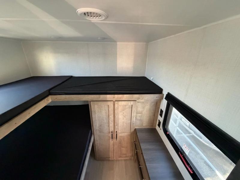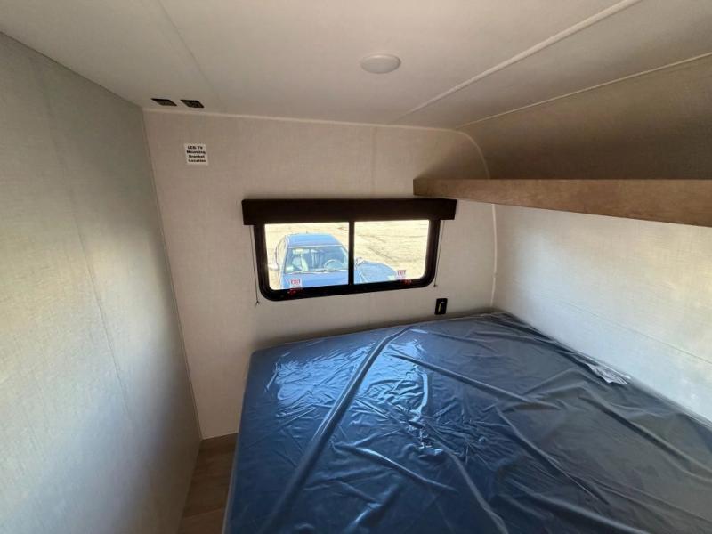 Camping with friends and family is easier than ever in this spacious trailer with a rear private bunkhouse! You'll find triple bunks in this room, along with a dresser and closet to keep everything tidy. The front private bedroom will feel just like home with its queen bed, plus dual closets and dual nightstands. Your crew can all gather in the main living area to relax on the sofa or play a game at the booth dinette, and there is even TV prep in this room if you enjoy movie nights. Head outdoors to relax under the 16' power awning.