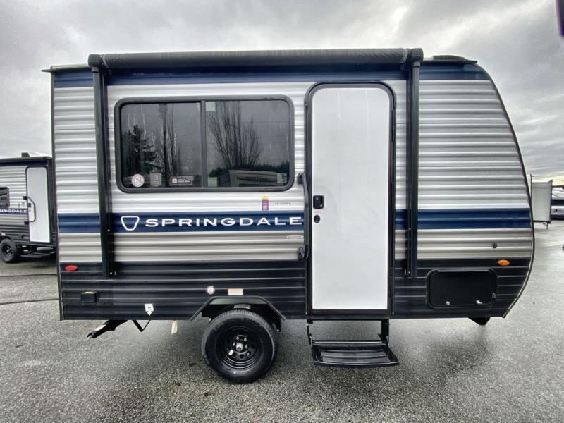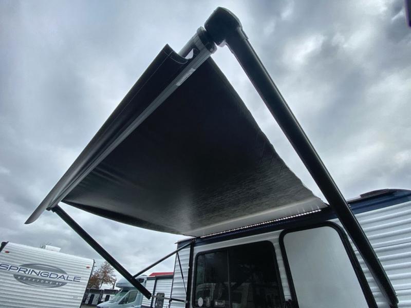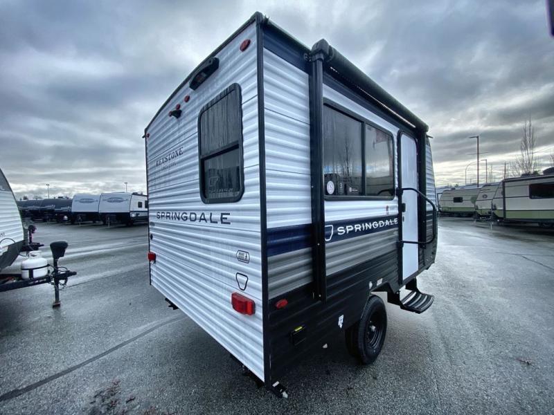 With any Springdale Mini travel trailer by Keystone, you will enjoy lightweight towing thanks to their single axle! The XL tinted safety glass windows are ultra durable, and the power awning will provide protection from the sun as you relax in your camp chairs outside. Each model includes blackout night shades, LED lighting, plus many more interior comforts. There is also a 20K BTU furnace to keep you comfortable, plus a tankless water heater for endless hot showers!