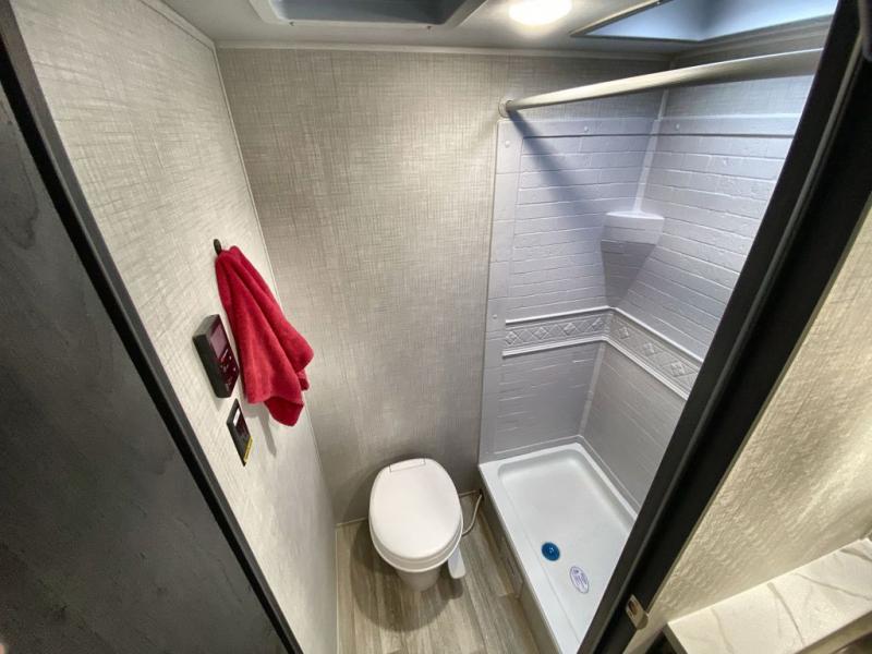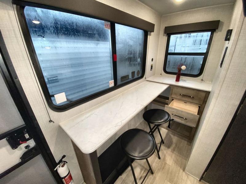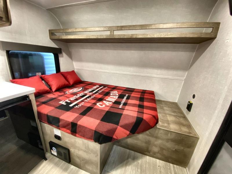 Your small crew will love camping in this lightweight travel trailer. There is a full-size bed up front with an overhead shelf to keep belongings out of the way. The two-burner cooktop and microwave oven will let you make breakfast in the morning, and the bar table with two stools provides a place to dine together. And a private bath with a shower and toilet lets you easily clean up after a day outdoors!