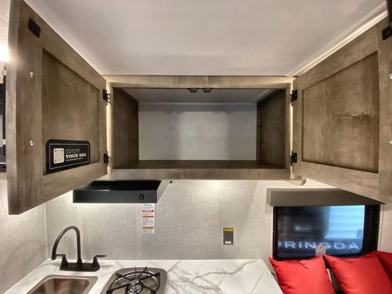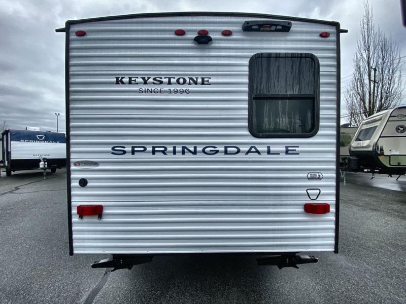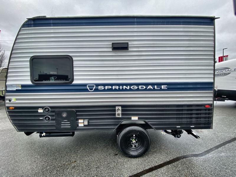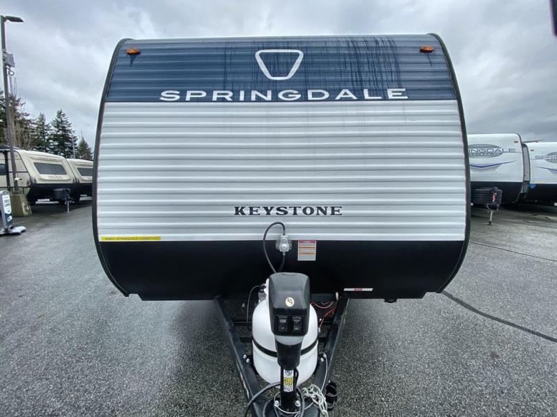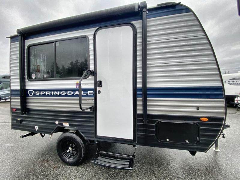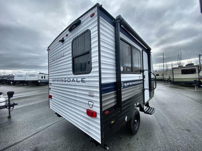With any Springdale Mini travel trailer by Keystone, you will enjoy lightweight towing thanks to their single axle! The XL tinted safety glass windows are ultra durable, and the power awning will provide protection from the sun as you relax in your camp chairs outside. Each model includes blackout night shades, LED lighting, plus many more interior comforts. There is also a 20K BTU furnace to keep you comfortable, plus a tankless water heater for endless hot showers!