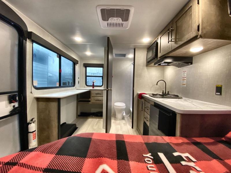 Your small crew will love camping in this lightweight travel trailer. There is a full-size bed up front with an overhead shelf to keep belongings out of the way. The two-burner cooktop and microwave oven will let you make breakfast in the morning, and the bar table with two stools provides a place to dine together. And a private bath with a shower and toilet lets you easily clean up after a day outdoors!