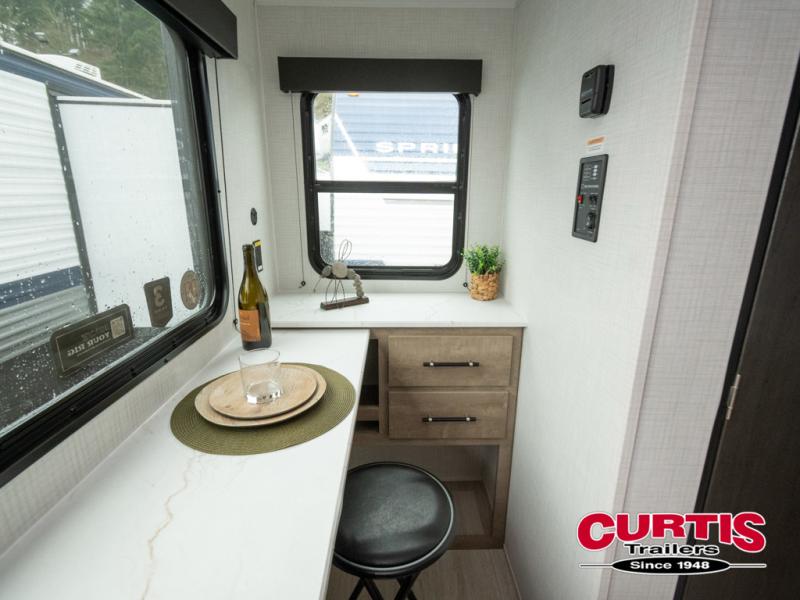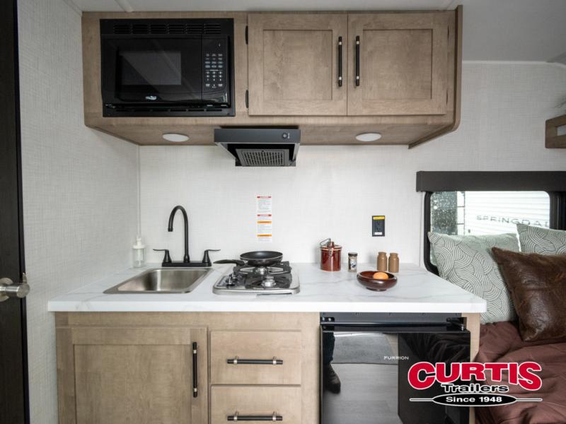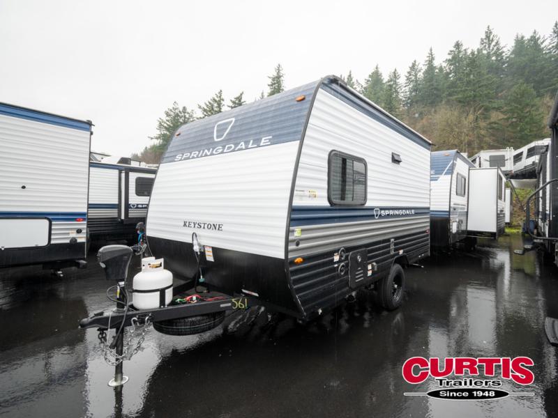 With any Springdale Mini travel trailer by Keystone, you will enjoy lightweight towing thanks to their single axle! The XL tinted safety glass windows are ultra durable, and the power awning will provide protection from the sun as you relax in your camp chairs outside. Each model includes blackout night shades, LED lighting, plus many more interior comforts. There is also a 20K BTU furnace to keep you comfortable, plus a tankless water heater for endless hot showers!