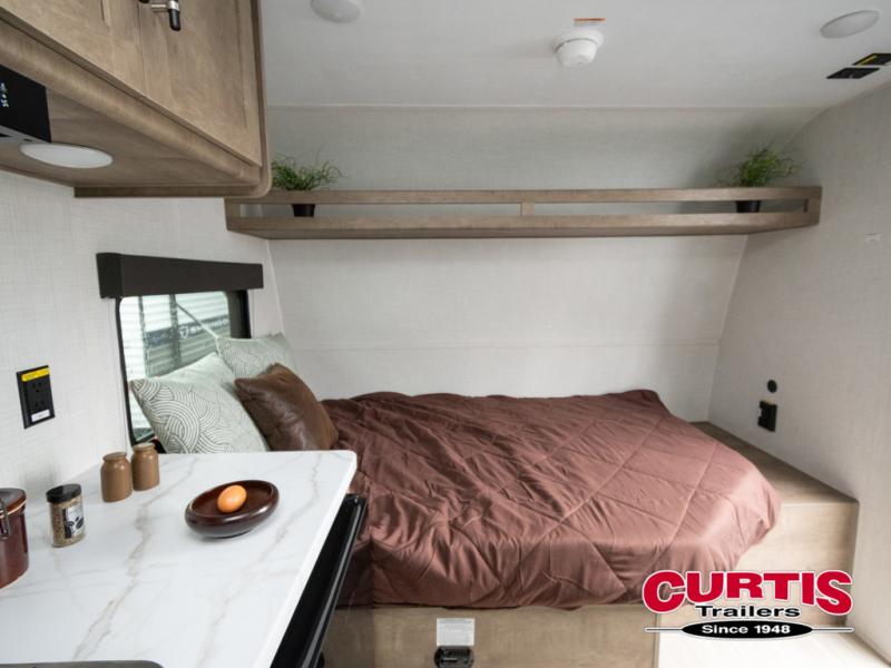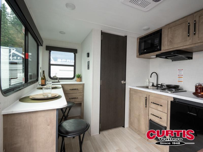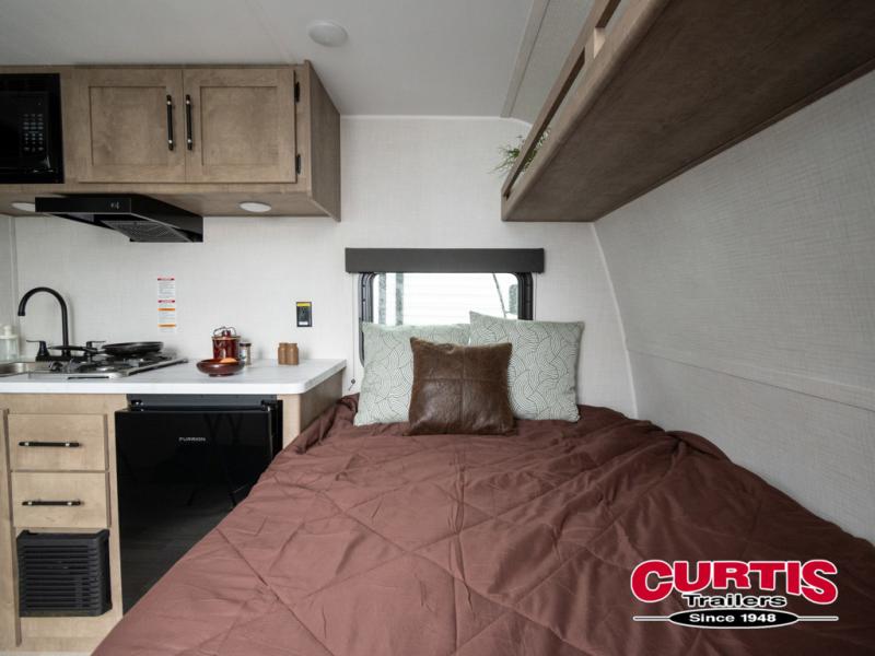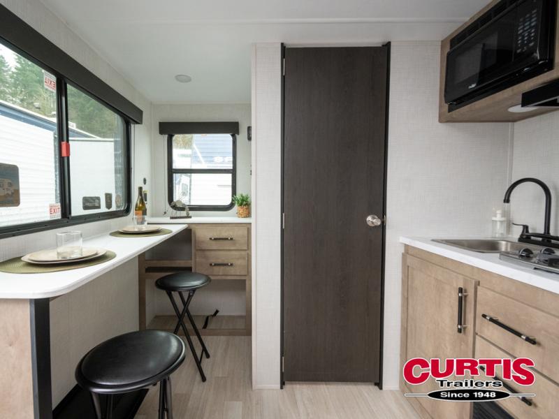 Your small crew will love camping in this lightweight travel trailer. There is a full-size bed up front with an overhead shelf to keep belongings out of the way. The two-burner cooktop and microwave oven will let you make breakfast in the morning, and the bar table with two stools provides a place to dine together. And a private bath with a shower and toilet lets you easily clean up after a day outdoors!