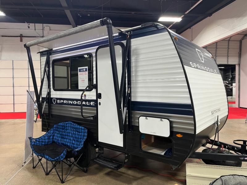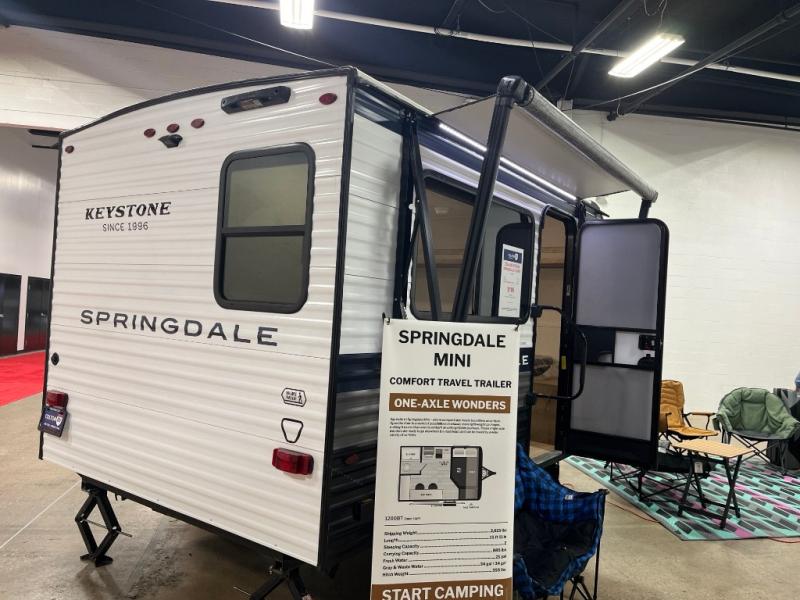 With any Springdale Mini travel trailer by Keystone, you will enjoy lightweight towing thanks to their single axle! The XL tinted safety glass windows are ultra durable, and the power awning will provide protection from the sun as you relax in your camp chairs outside. Each model includes blackout night shades, LED lighting, plus many more interior comforts. There is also a 20K BTU furnace to keep you comfortable, plus a tankless water heater for endless hot showers!