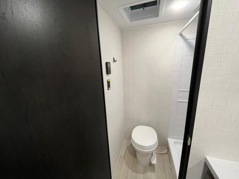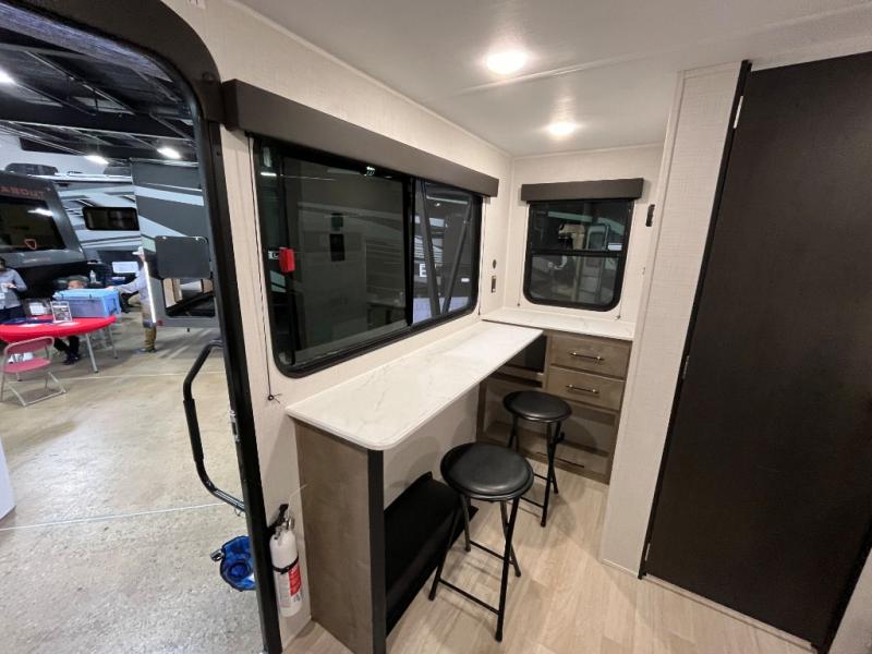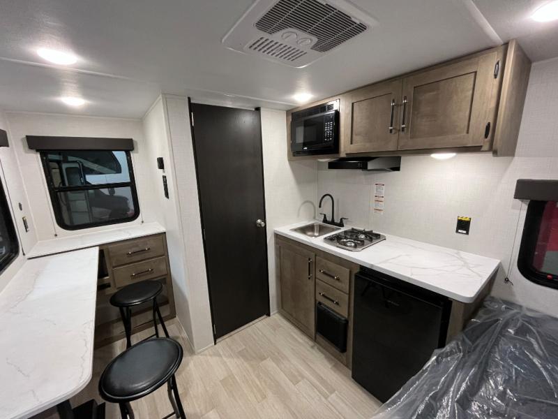 Your small crew will love camping in this lightweight travel trailer. There is a full-size bed up front with an overhead shelf to keep belongings out of the way. The two-burner cooktop and microwave oven will let you make breakfast in the morning, and the bar table with two stools provides a place to dine together. And a private bath with a shower and toilet lets you easily clean up after a day outdoors!
