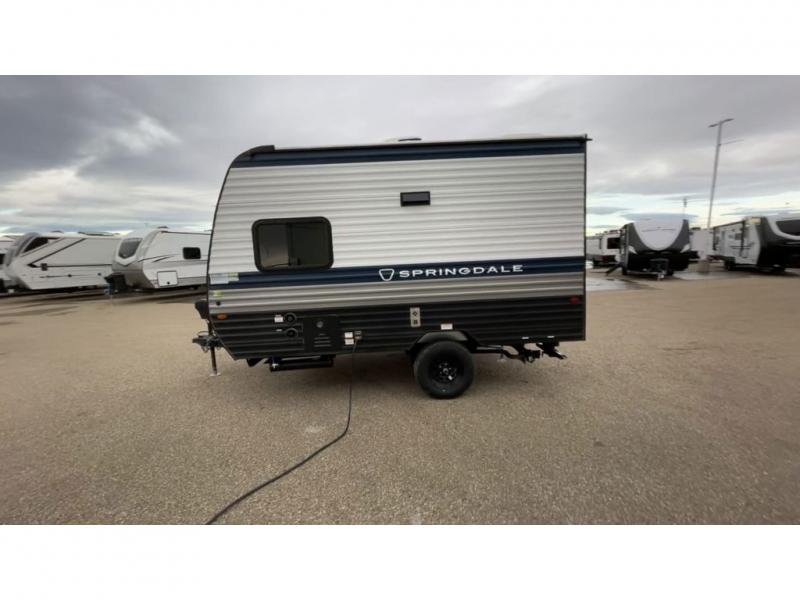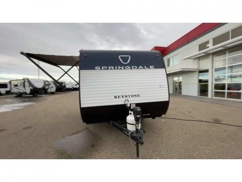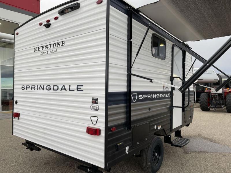 With any Springdale Mini travel trailer by Keystone, you will enjoy lightweight towing thanks to their single axle! The XL tinted safety glass windows are ultra durable, and the power awning will provide protection from the sun as you relax in your camp chairs outside. Each model includes blackout night shades, LED lighting, plus many more interior comforts. There is also a 20K BTU furnace to keep you comfortable, plus a tankless water heater for endless hot showers!