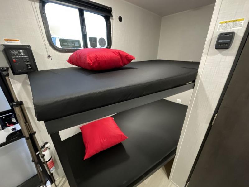This lightweight travel trailer is perfect for six happy campers. You'll enjoy the front full-size bed, while your guests or little ones take the double-size bunks. There is also a shelf above the bed to keep your things organized. A private bath includes a shower with a toilet so you can freshen up each day without having to leave your camper. You can make your meals on the two-burner gas cooktop or in the microwave oven, then take your plate outdoors to eat under the 8' power awning!