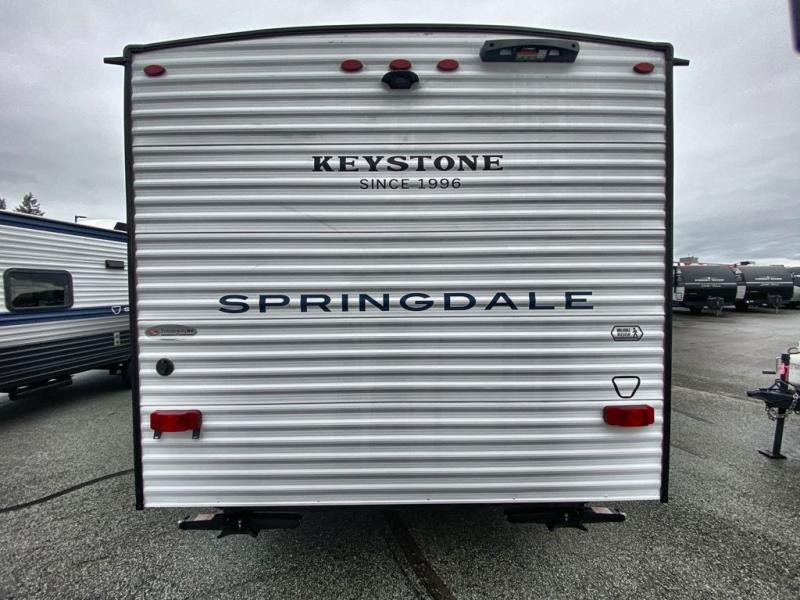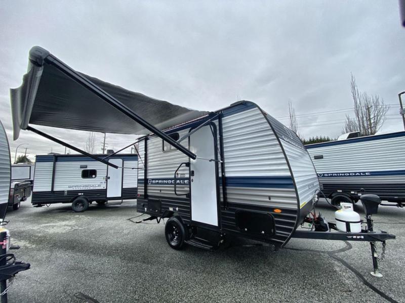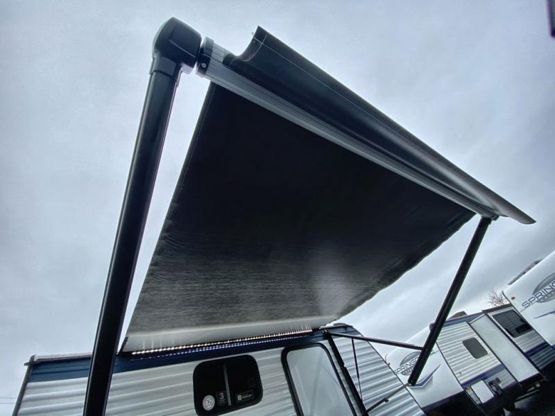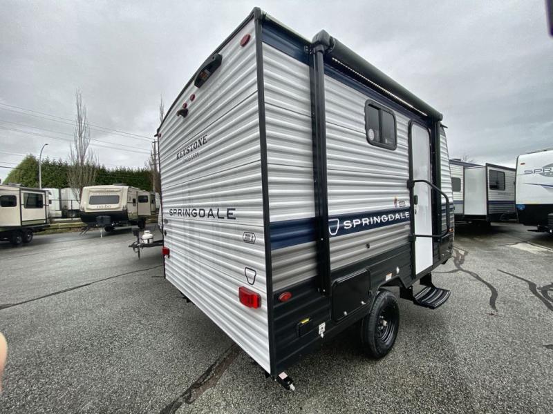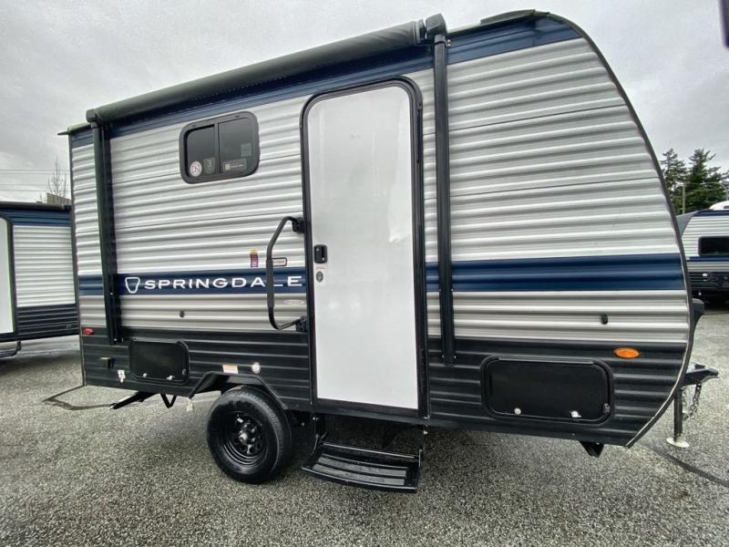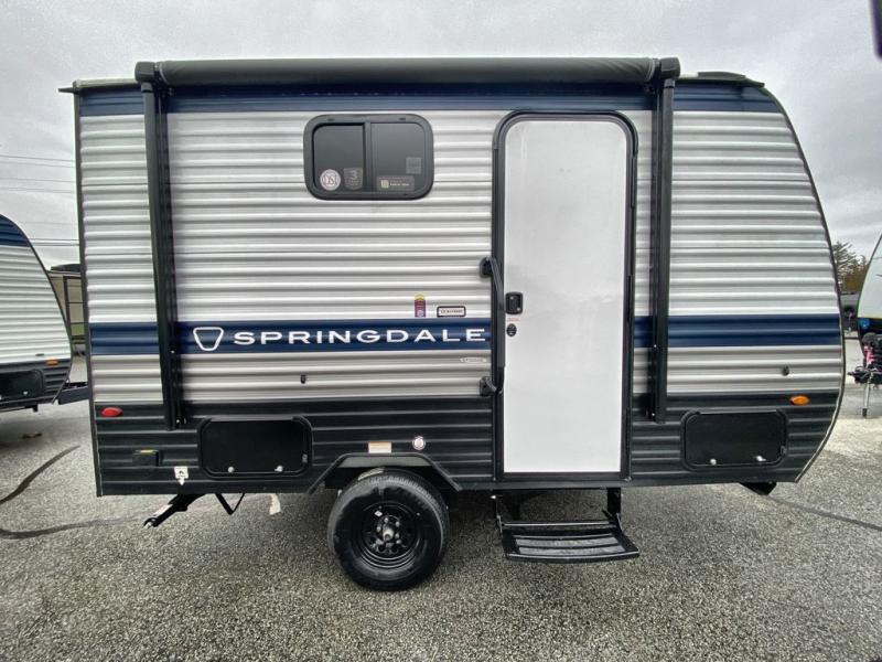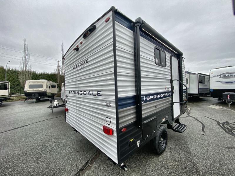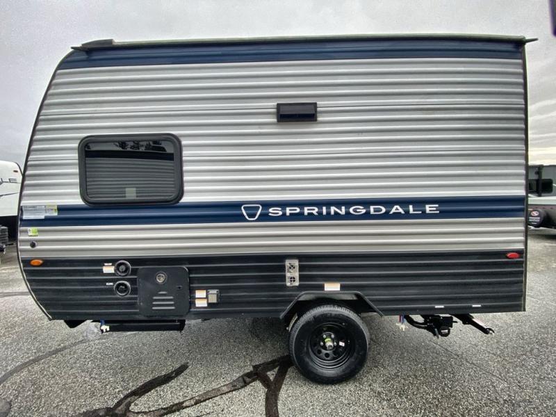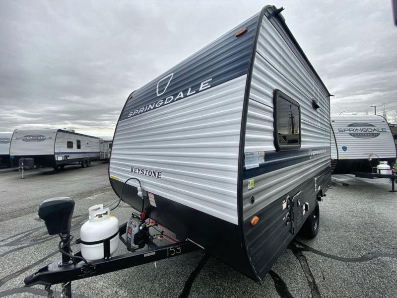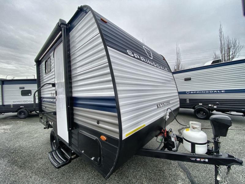With any Springdale Mini travel trailer by Keystone, you will enjoy lightweight towing thanks to their single axle! The XL tinted safety glass windows are ultra durable, and the power awning will provide protection from the sun as you relax in your camp chairs outside. Each model includes blackout night shades, LED lighting, plus many more interior comforts. There is also a 20K BTU furnace to keep you comfortable, plus a tankless water heater for endless hot showers!