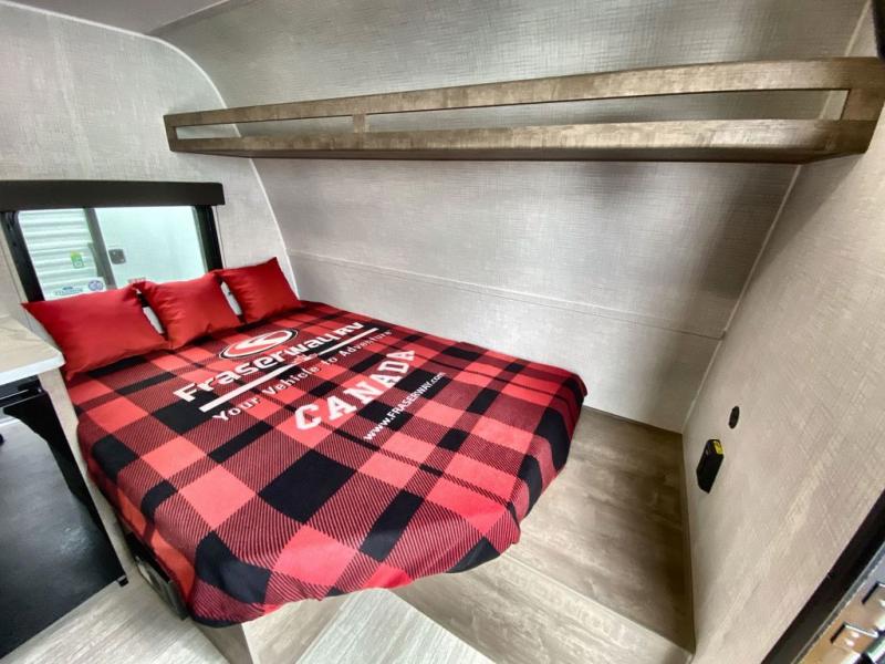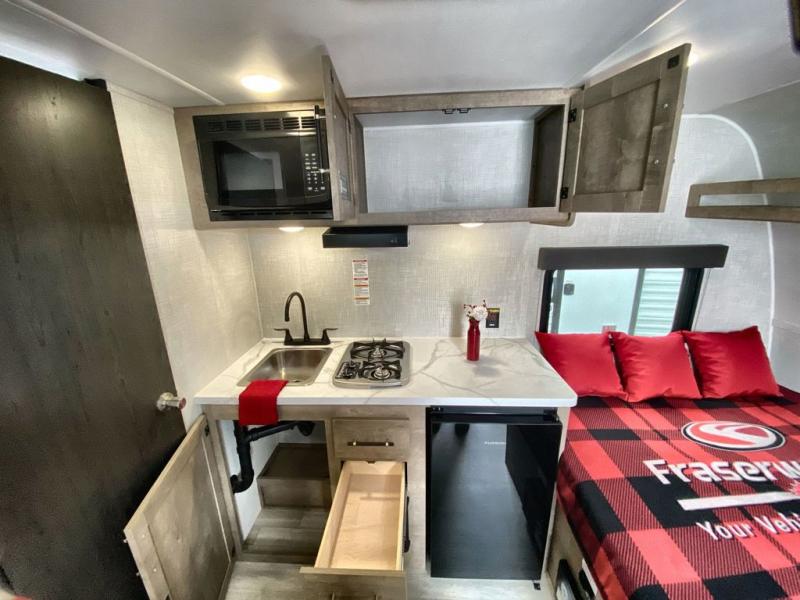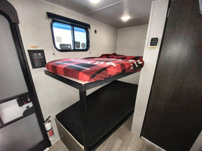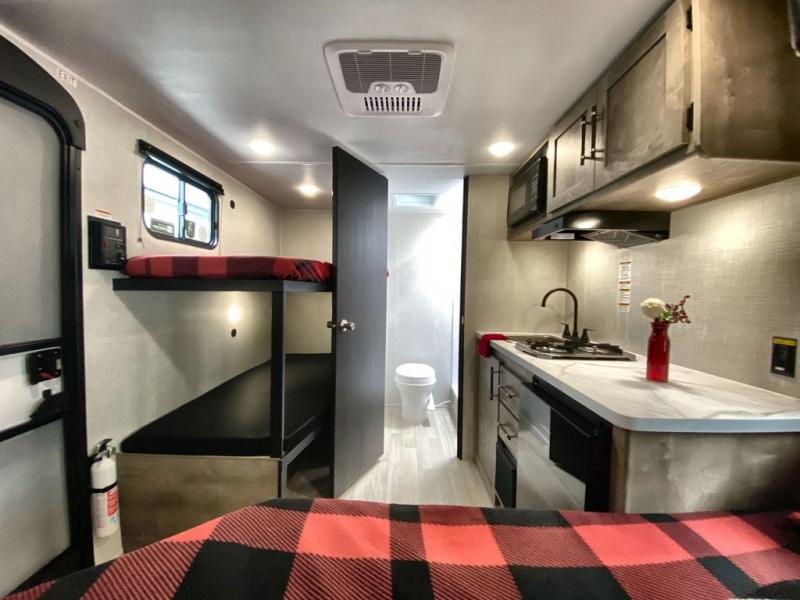 This lightweight travel trailer is perfect for six happy campers. You'll enjoy the front full-size bed, while your guests or little ones take the double-size bunks. There is also a shelf above the bed to keep your things organized. A private bath includes a shower with a toilet so you can freshen up each day without having to leave your camper. You can make your meals on the two-burner gas cooktop or in the microwave oven, then take your plate outdoors to eat under the 8' power awning!