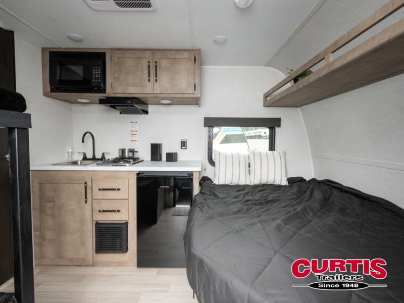 This lightweight travel trailer is perfect for six happy campers. You'll enjoy the front full-size bed, while your guests or little ones take the double-size bunks. There is also a shelf above the bed to keep your things organized. A private bath includes a shower with a toilet so you can freshen up each day without having to leave your camper. You can make your meals on the two-burner gas cooktop or in the microwave oven, then take your plate outdoors to eat under the 8' power awning!