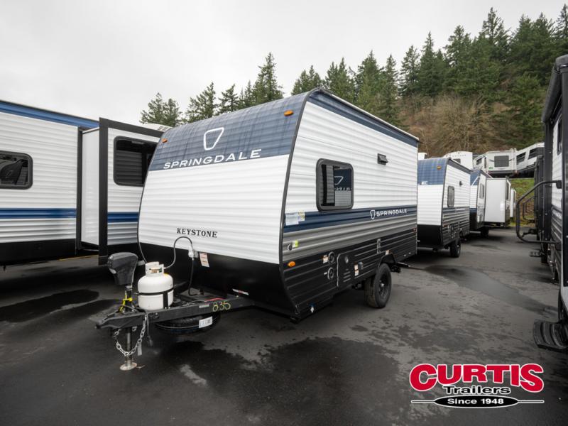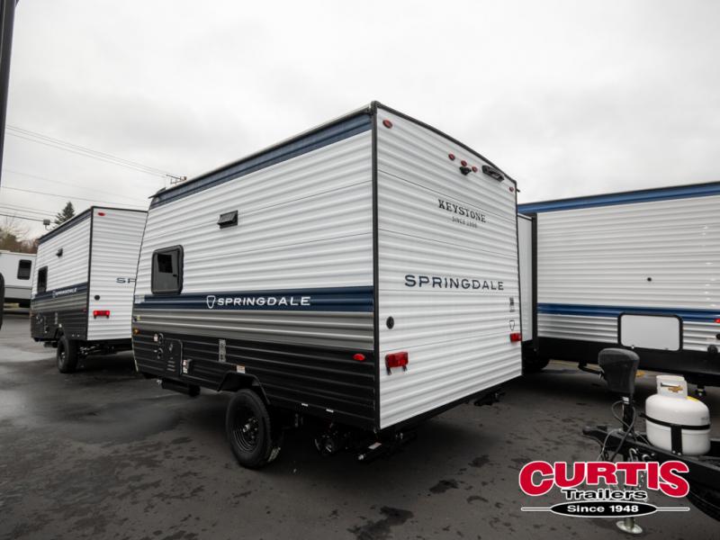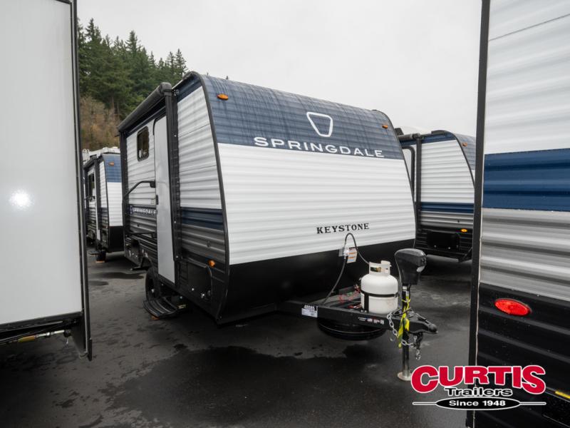 With any Springdale Mini travel trailer by Keystone, you will enjoy lightweight towing thanks to their single axle! The XL tinted safety glass windows are ultra durable, and the power awning will provide protection from the sun as you relax in your camp chairs outside. Each model includes blackout night shades, LED lighting, plus many more interior comforts. There is also a 20K BTU furnace to keep you comfortable, plus a tankless water heater for endless hot showers!