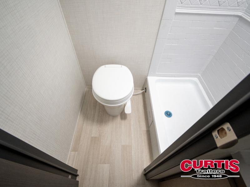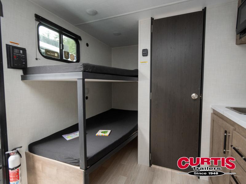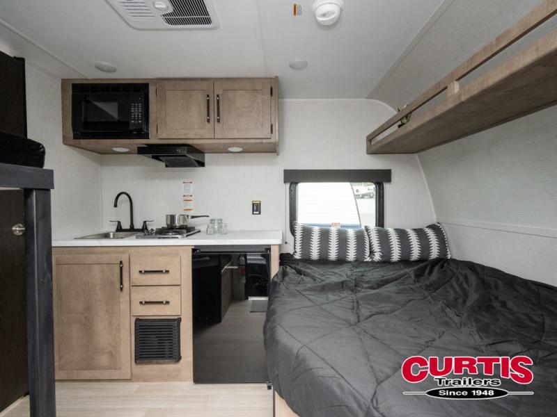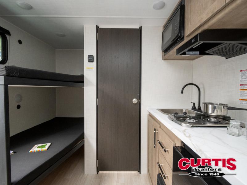 This lightweight travel trailer is perfect for six happy campers. You'll enjoy the front full-size bed, while your guests or little ones take the double-size bunks. There is also a shelf above the bed to keep your things organized. A private bath includes a shower with a toilet so you can freshen up each day without having to leave your camper. You can make your meals on the two-burner gas cooktop or in the microwave oven, then take your plate outdoors to eat under the 8' power awning!
