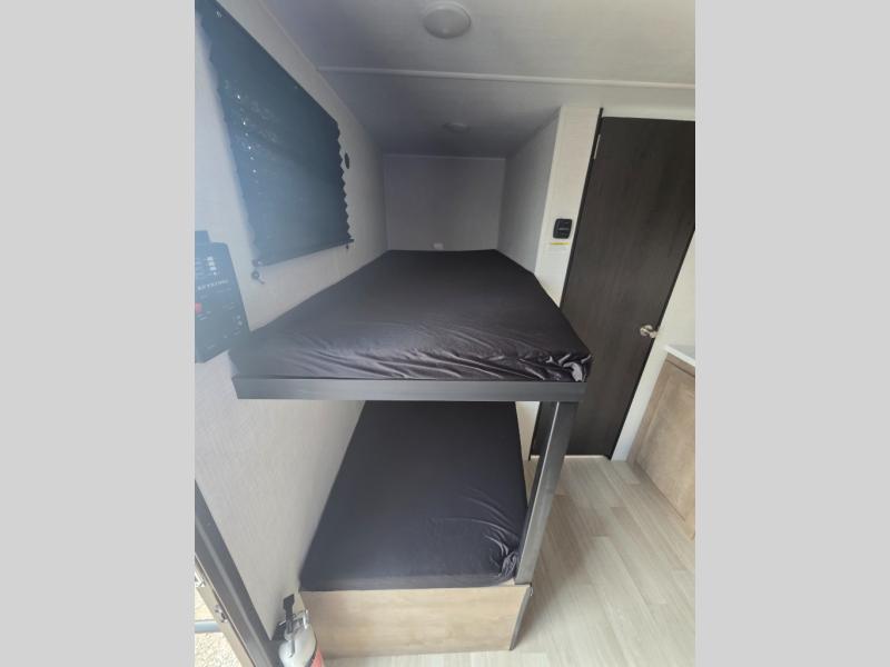This lightweight travel trailer is perfect for six happy campers. You'll enjoy the front full-size bed, while your guests or little ones take the double-size bunks. There is also a shelf above the bed to keep your things organized. A private bath includes a shower with a toilet so you can freshen up each day without having to leave your camper. You can make your meals on the two-burner gas cooktop or in the microwave oven, then take your plate outdoors to eat under the 8' power awning!