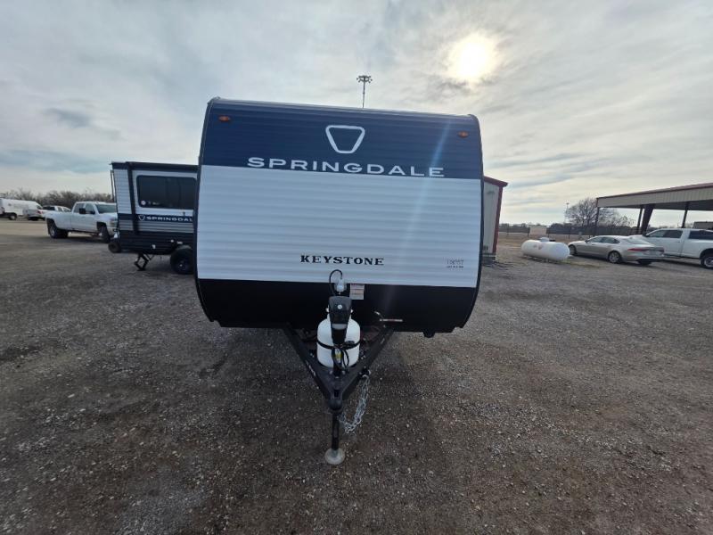 With any Springdale Mini travel trailer by Keystone, you will enjoy lightweight towing thanks to their single axle! The XL tinted safety glass windows are ultra durable, and the power awning will provide protection from the sun as you relax in your camp chairs outside. Each model includes blackout night shades, LED lighting, plus many more interior comforts. There is also a 20K BTU furnace to keep you comfortable, plus a tankless water heater for endless hot showers!
