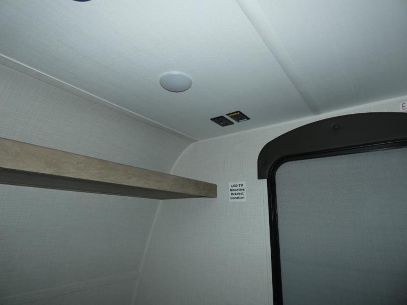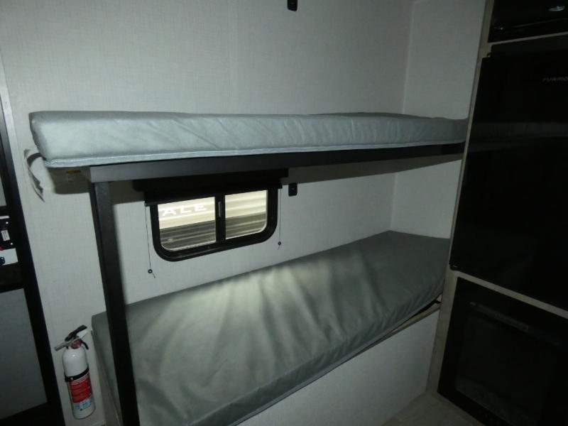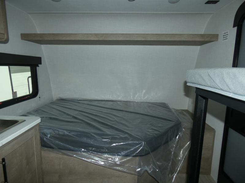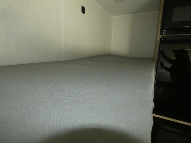 This lightweight travel trailer is perfect for four happy campers. You'll enjoy the front full-size bed, while your guests or little ones take the 28" x 74" bunk beds. There is also a shelf above the bed to keep your things organized. A private bath includes a shower with a toilet so you can freshen up each day without having to leave your camper. You can make your meals on the two burner gas cooktop or in the microwave oven, then take your plate outdoors to eat under the 8' power awning!