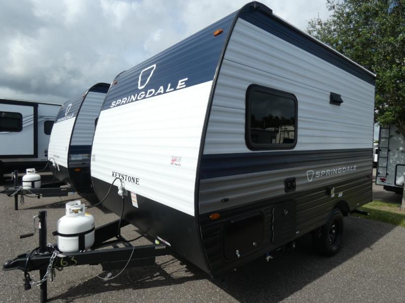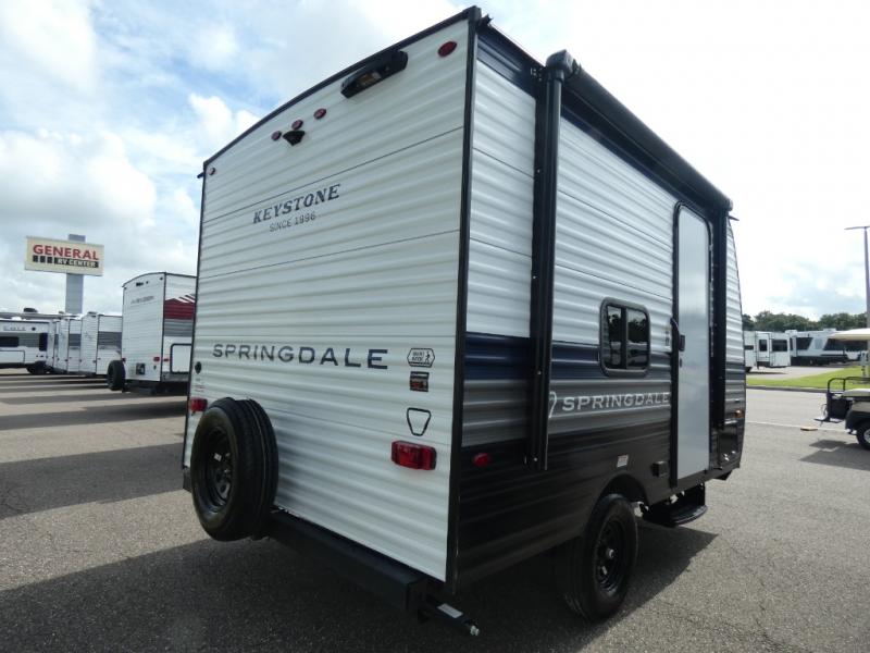 With any Springdale Mini travel trailer by Keystone, you will enjoy lightweight towing thanks to their single-axle! The AlphaPly TPO roof membrane is ultra durable, and the power awning will provide protection from the sun as you relax in your camp chairs outside. Each model includes blackout night shades, LED lighting, plus many more interior comforts. There is also a roof A/C and 20K BTU furnace to keep you comfortable, plus a tankless water heater for endless hot showers!