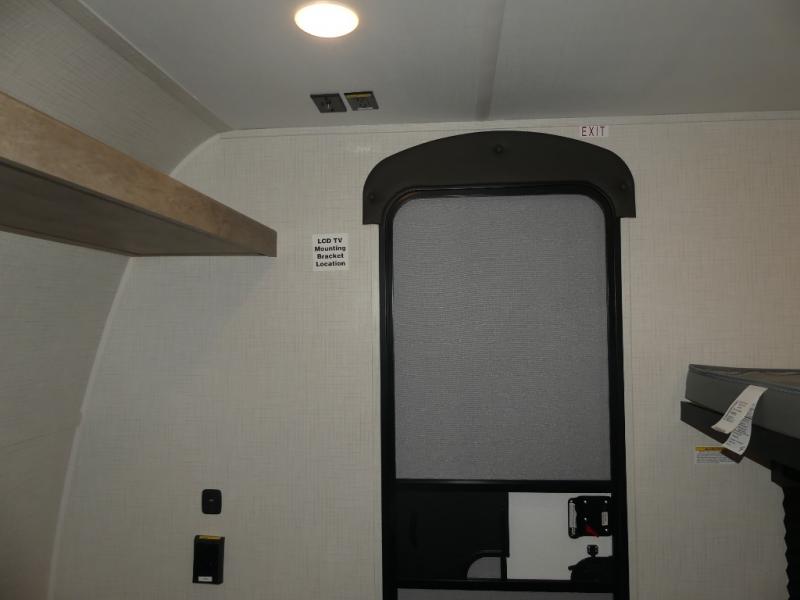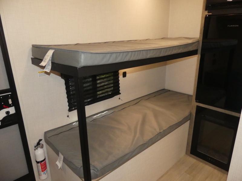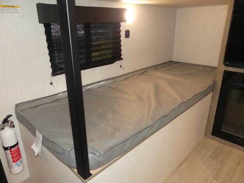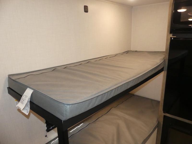 This lightweight travel trailer is perfect for four happy campers. You'll enjoy the front full-size bed, while your guests or little ones take the 28" x 74" bunk beds. There is also a shelf above the bed to keep your things organized. A private bath includes a shower with a toilet so you can freshen up each day without having to leave your camper. You can make your meals on the two burner gas cooktop or in the microwave oven, then take your plate outdoors to eat under the 8' power awning!