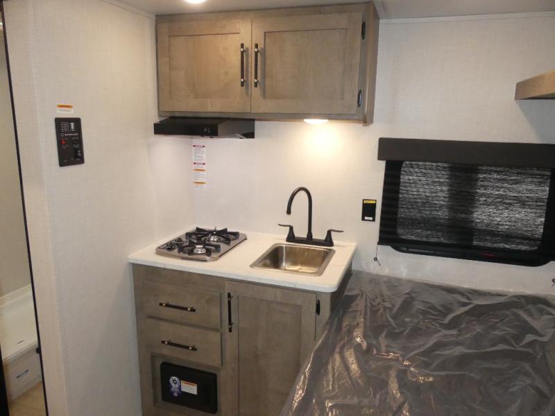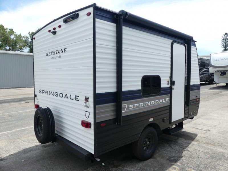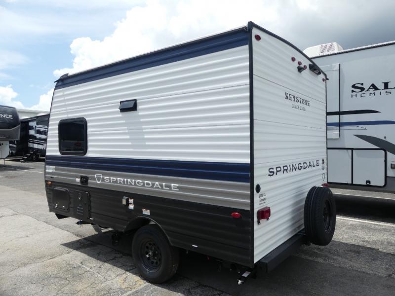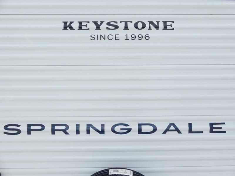 With any Springdale Mini travel trailer by Keystone, you will enjoy lightweight towing thanks to their single-axle! The AlphaPly TPO roof membrane is ultra durable, and the power awning will provide protection from the sun as you relax in your camp chairs outside. Each model includes blackout night shades, LED lighting, plus many more interior comforts. There is also a roof A/C and 20K BTU furnace to keep you comfortable, plus a tankless water heater for endless hot showers!