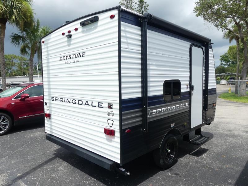 With any Springdale Mini travel trailer by Keystone, you will enjoy lightweight towing thanks to their single-axle! The AlphaPly TPO roof membrane is ultra durable, and the power awning will provide protection from the sun as you relax in your camp chairs outside. Each model includes blackout night shades, LED lighting, plus many more interior comforts. There is also a roof A/C and 20K BTU furnace to keep you comfortable, plus a tankless water heater for endless hot showers!