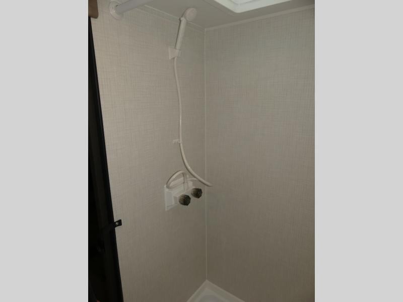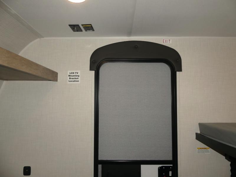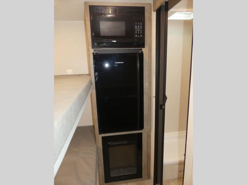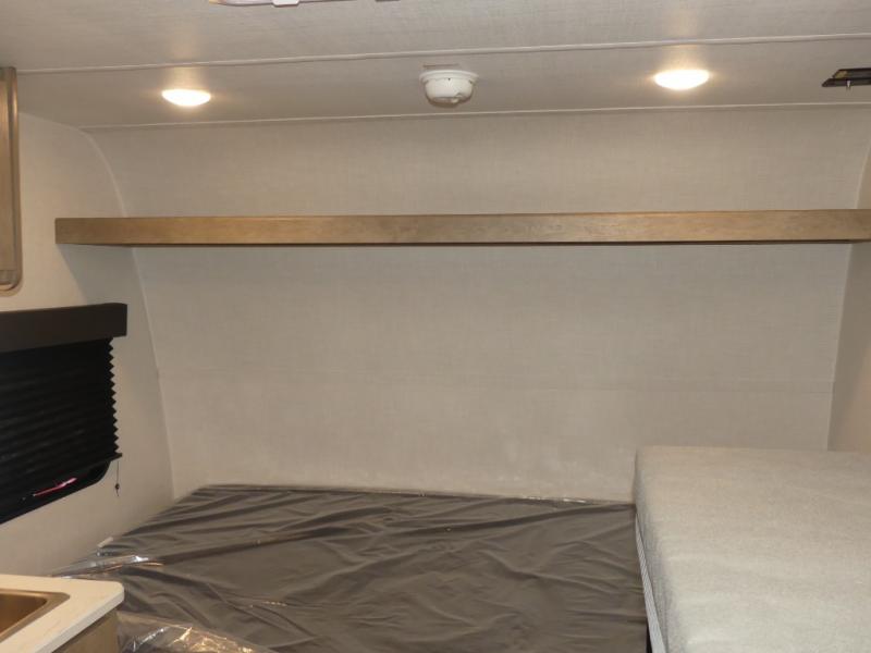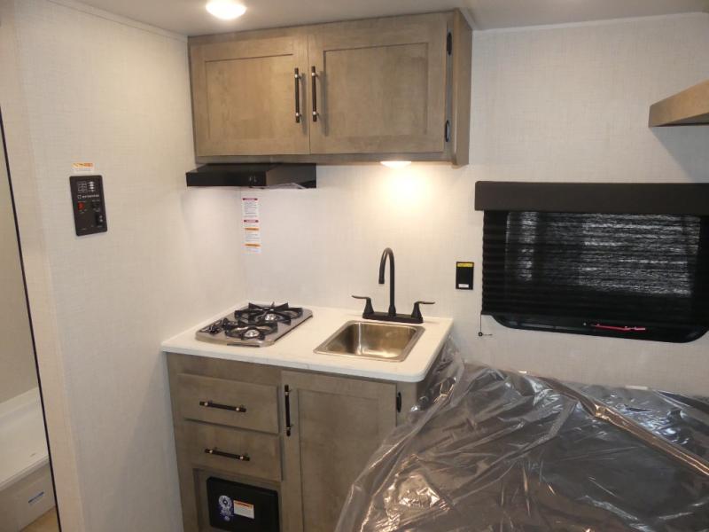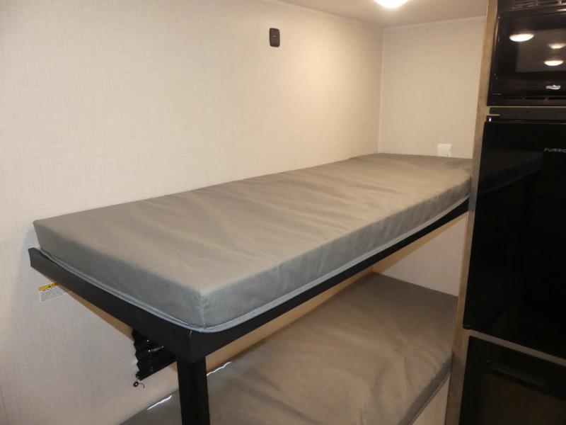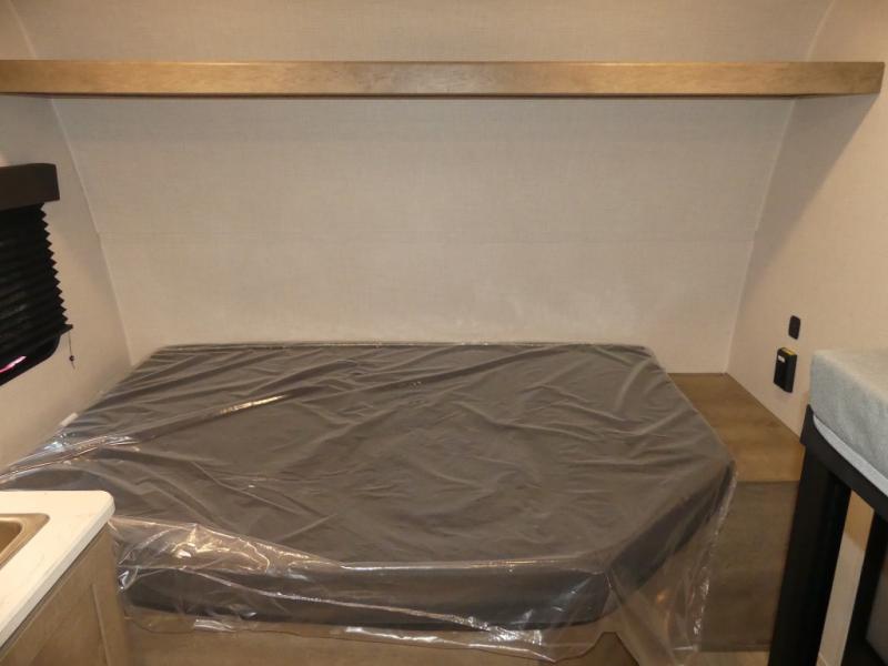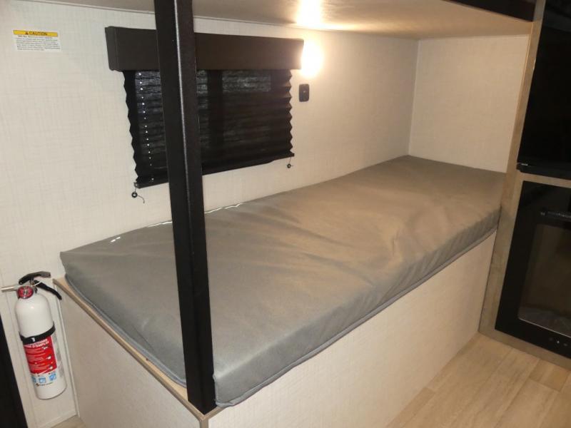 This lightweight travel trailer is perfect for four happy campers. You'll enjoy the front full-size bed, while your guests or little ones take the 28" x 74" bunk beds. There is also a shelf above the bed to keep your things organized. A private bath includes a shower with a toilet so you can freshen up each day without having to leave your camper. You can make your meals on the two burner gas cooktop or in the microwave oven, then take your plate outdoors to eat under the 8' power awning!
