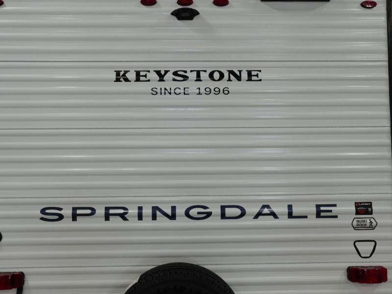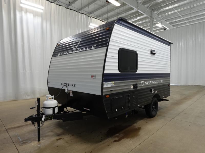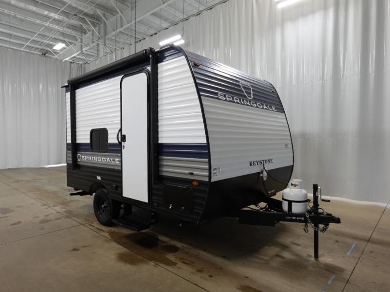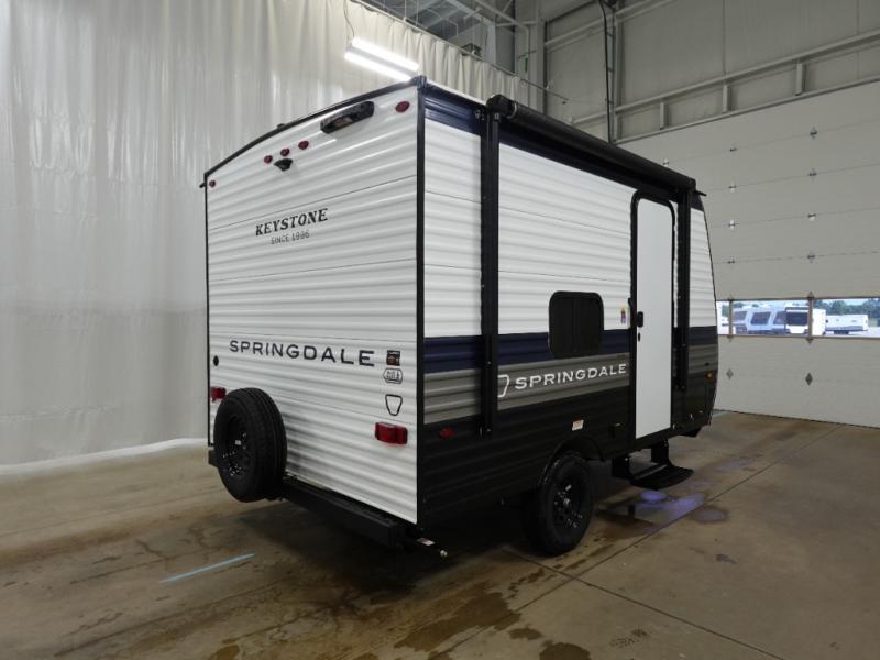 With any Springdale Mini travel trailer by Keystone, you will enjoy lightweight towing thanks to their single-axle! The AlphaPly TPO roof membrane is ultra durable, and the power awning will provide protection from the sun as you relax in your camp chairs outside. Each model includes blackout night shades, LED lighting, plus many more interior comforts. There is also a roof A/C and 20K BTU furnace to keep you comfortable, plus a tankless water heater for endless hot showers!
