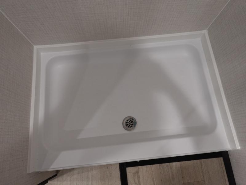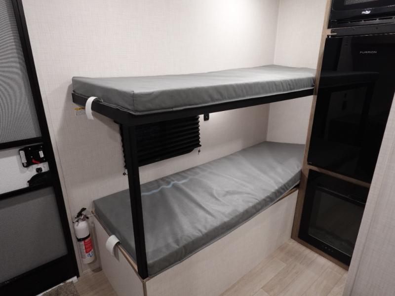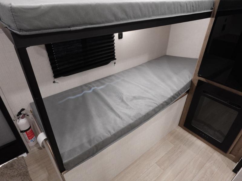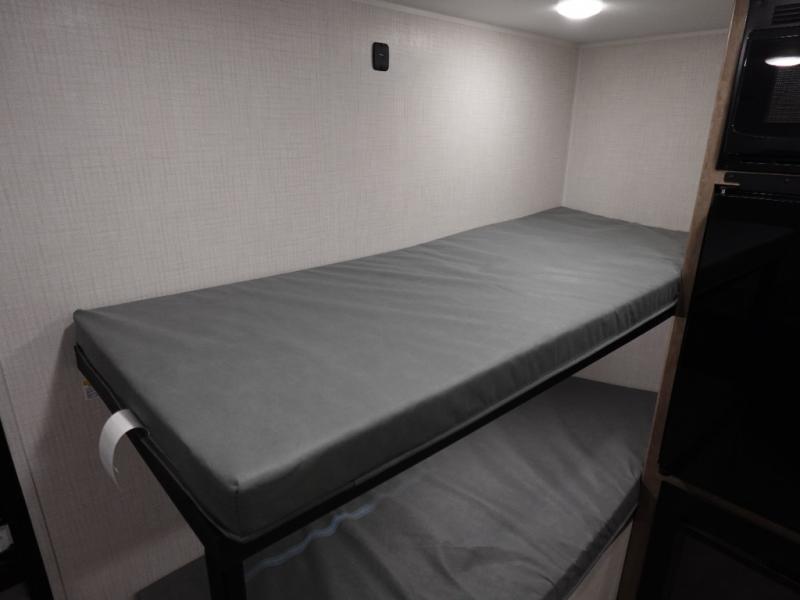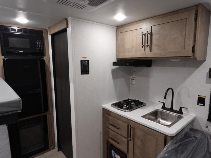 This lightweight travel trailer is perfect for four happy campers. You'll enjoy the front full-size bed, while your guests or little ones take the 28" x 74" bunk beds. There is also a shelf above the bed to keep your things organized. A private bath includes a shower with a toilet so you can freshen up each day without having to leave your camper. You can make your meals on the two burner gas cooktop or in the microwave oven, then take your plate outdoors to eat under the 8' power awning!