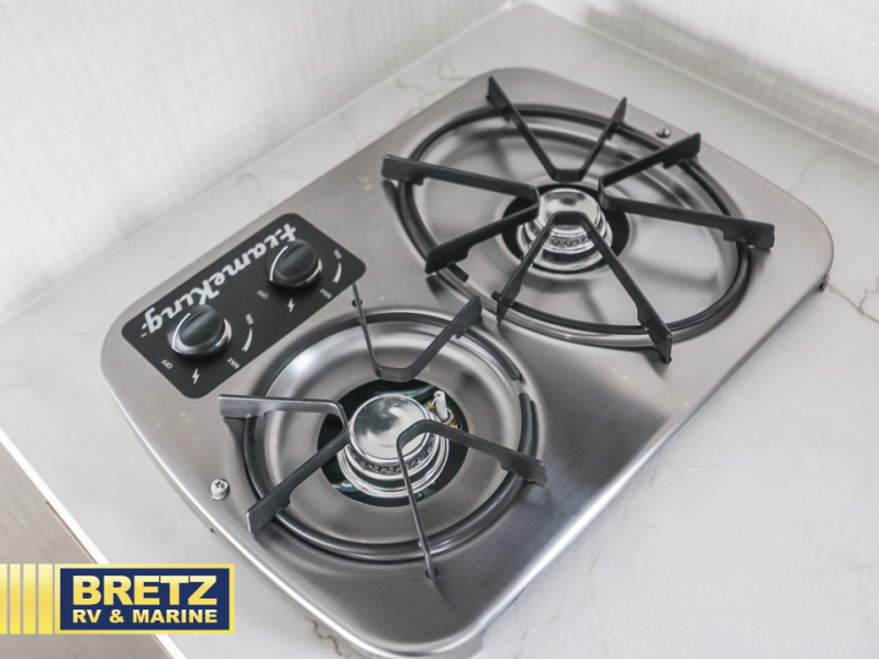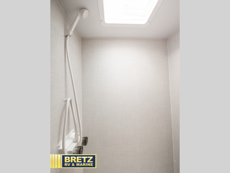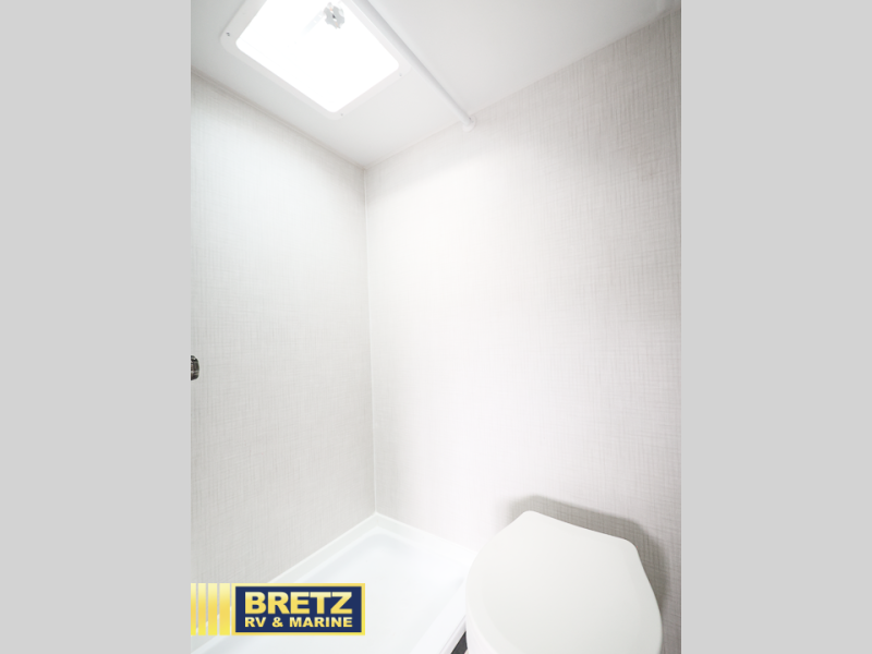 This lightweight travel trailer is perfect for four happy campers. You'll enjoy the front full-size bed, while your guests or little ones take the 28" x 74" bunk beds. There is also a shelf above the bed to keep your things organized. A private bath includes a shower with a toilet so you can freshen up each day without having to leave your camper. You can make your meals on the two burner gas cooktop or in the microwave oven, then take your plate outdoors to eat under the 8' power awning!