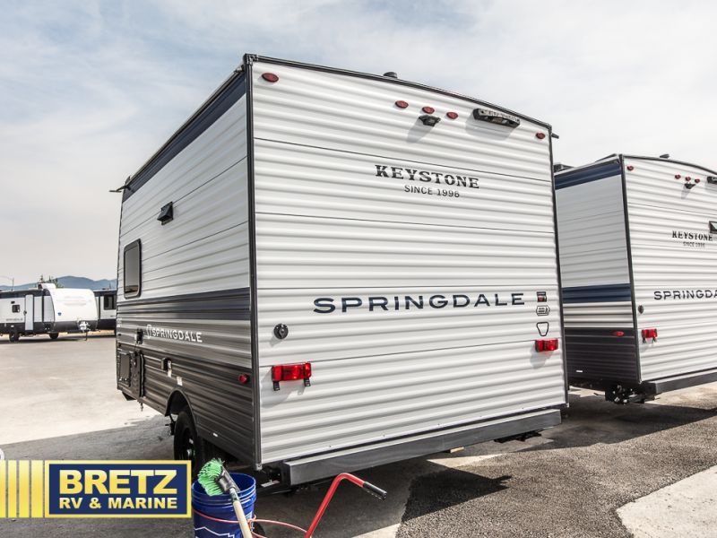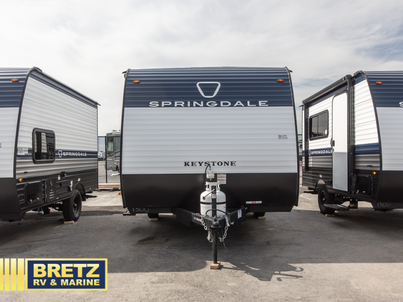 With any Springdale Mini travel trailer by Keystone, you will enjoy lightweight towing thanks to their single-axle! The AlphaPly TPO roof membrane is ultra durable, and the power awning will provide protection from the sun as you relax in your camp chairs outside. Each model includes blackout night shades, LED lighting, plus many more interior comforts. There is also a roof A/C and 20K BTU furnace to keep you comfortable, plus a tankless water heater for endless hot showers!