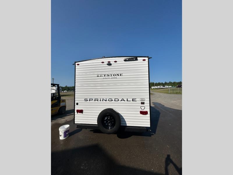 With any Springdale Mini travel trailer by Keystone, you will enjoy lightweight towing thanks to their single-axle! The AlphaPly TPO roof membrane is ultra durable, and the power awning will provide protection from the sun as you relax in your camp chairs outside. Each model includes blackout night shades, LED lighting, plus many more interior comforts. There is also a roof A/C and 20K BTU furnace to keep you comfortable, plus a tankless water heater for endless hot showers!