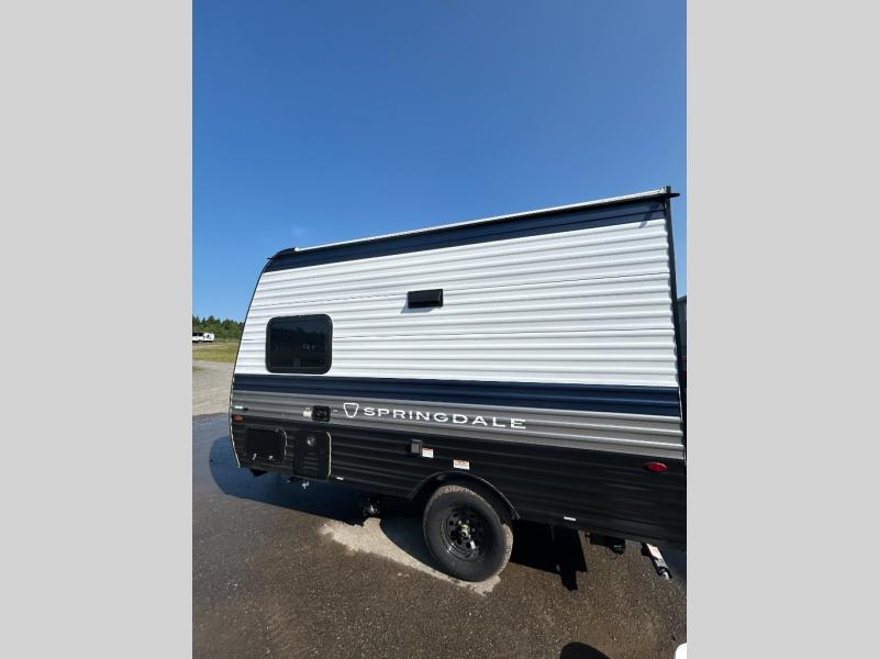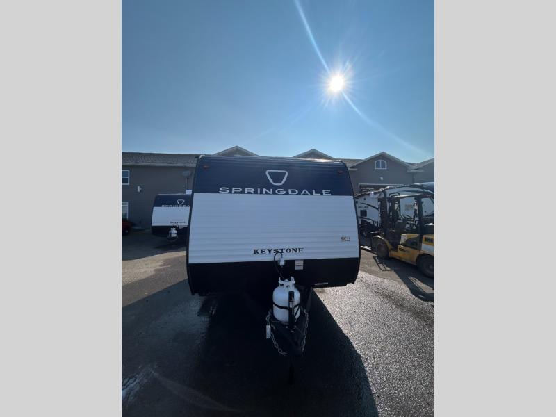 With any Springdale Mini travel trailer by Keystone, you will enjoy lightweight towing thanks to their single-axle! The AlphaPly TPO roof membrane is ultra durable, and the power awning will provide protection from the sun as you relax in your camp chairs outside. Each model includes blackout night shades, LED lighting, plus many more interior comforts. There is also a roof A/C and 20K BTU furnace to keep you comfortable, plus a tankless water heater for endless hot showers!