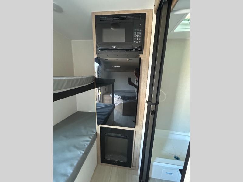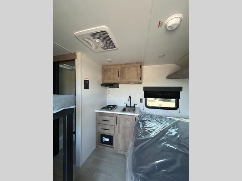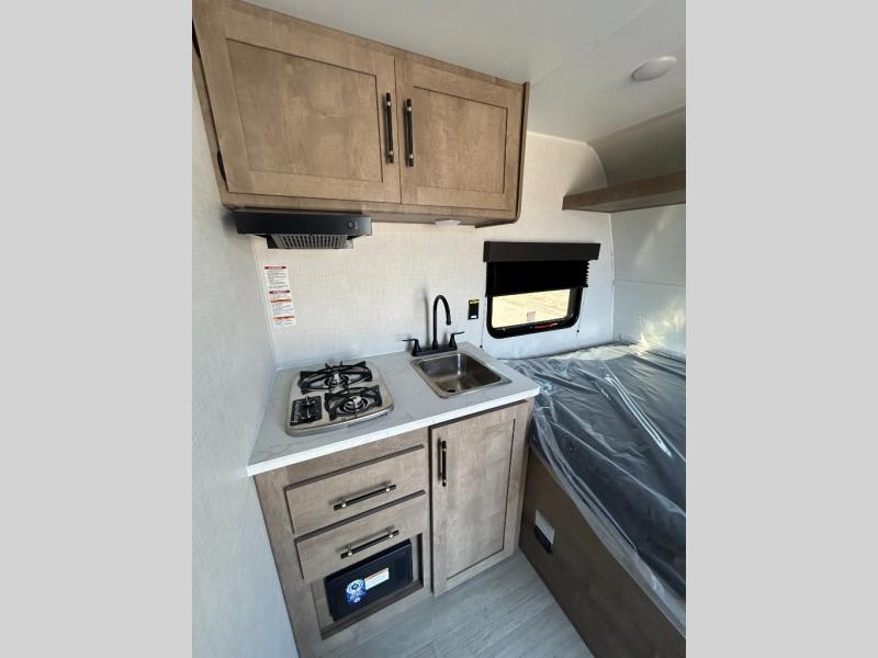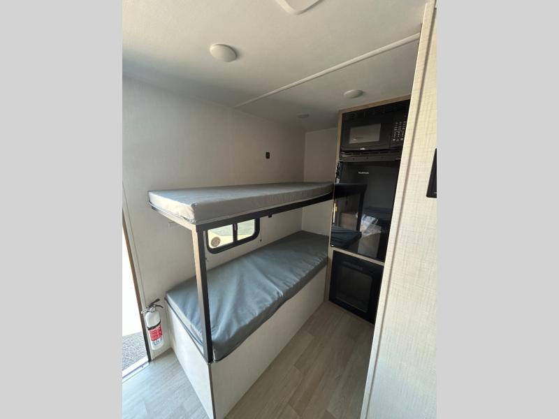 This lightweight travel trailer is perfect for four happy campers. You'll enjoy the front full-size bed, while your guests or little ones take the 28" x 74" bunk beds. There is also a shelf above the bed to keep your things organized. A private bath includes a shower with a toilet so you can freshen up each day without having to leave your camper. You can make your meals on the two burner gas cooktop or in the microwave oven, then take your plate outdoors to eat under the 8' power awning!