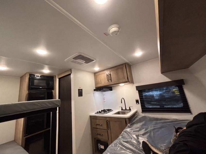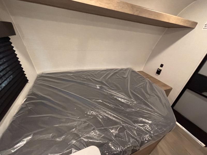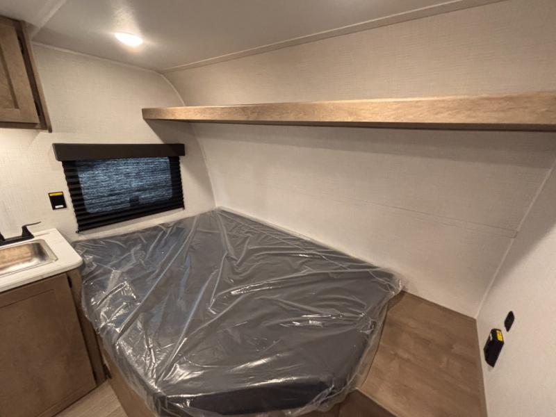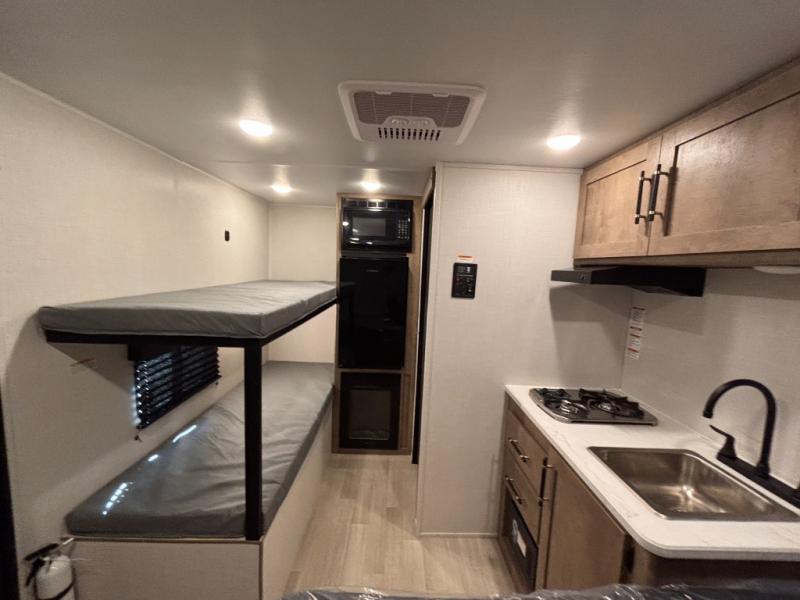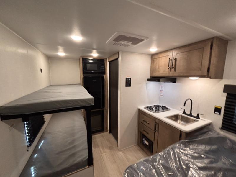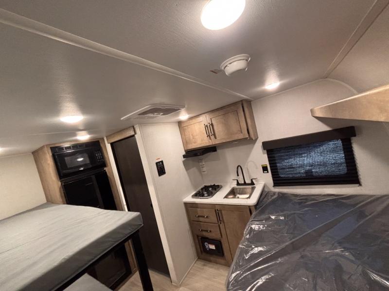 This lightweight travel trailer is perfect for four happy campers. You'll enjoy the front full-size bed, while your guests or little ones take the 28" x 74" bunk beds. There is also a shelf above the bed to keep your things organized. A private bath includes a shower with a toilet so you can freshen up each day without having to leave your camper. You can make your meals on the two burner gas cooktop or in the microwave oven, then take your plate outdoors to eat under the 8' power awning!