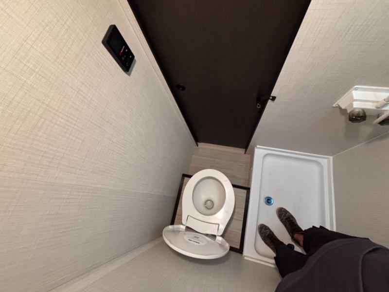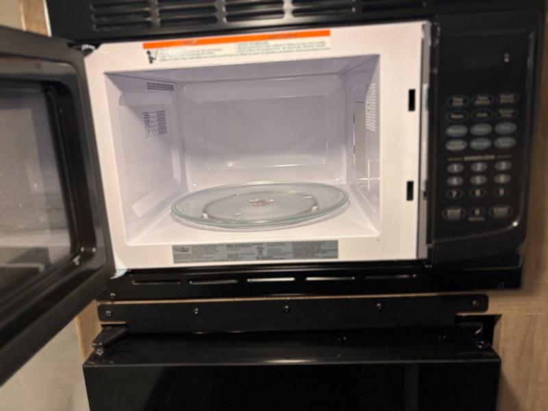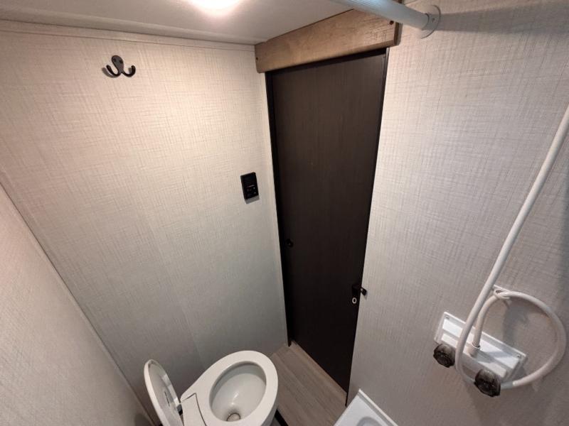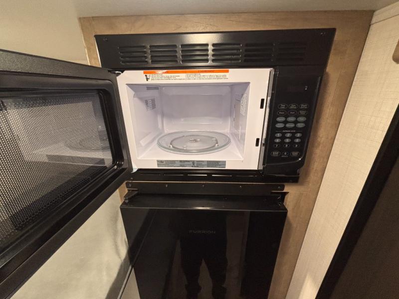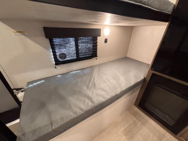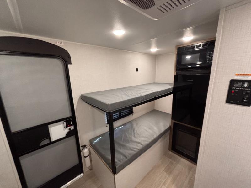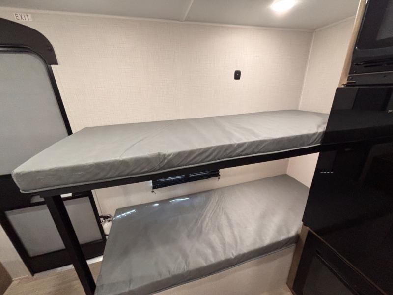 This lightweight travel trailer is perfect for four happy campers. You'll enjoy the front full-size bed, while your guests or little ones take the 28" x 74" bunk beds. There is also a shelf above the bed to keep your things organized. A private bath includes a shower with a toilet so you can freshen up each day without having to leave your camper. You can make your meals on the two burner gas cooktop or in the microwave oven, then take your plate outdoors to eat under the 8' power awning!