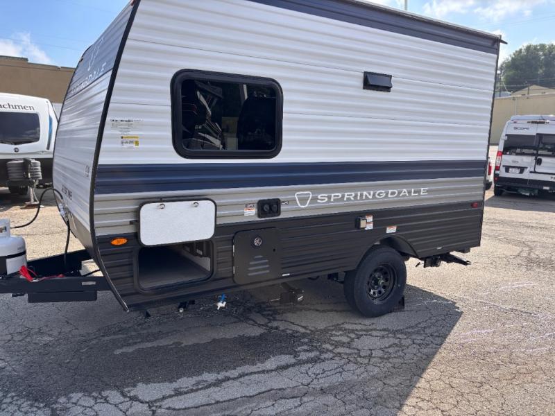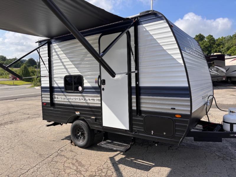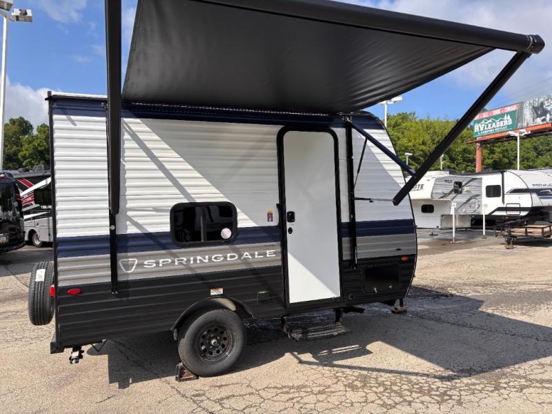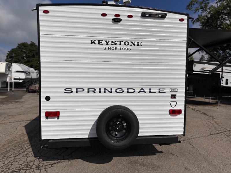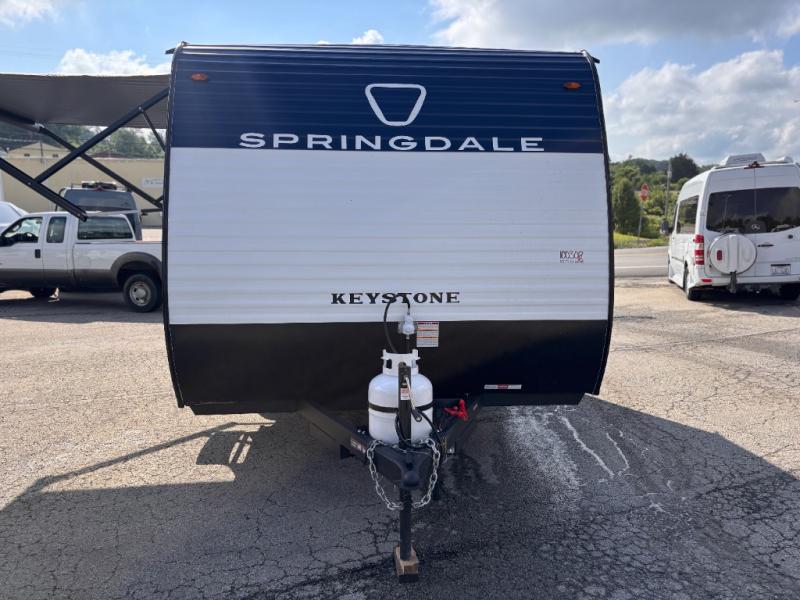 With any Springdale Mini travel trailer by Keystone, you will enjoy lightweight towing thanks to their single-axle! The AlphaPly TPO roof membrane is ultra durable, and the power awning will provide protection from the sun as you relax in your camp chairs outside. Each model includes blackout night shades, LED lighting, plus many more interior comforts. There is also a roof A/C and 20K BTU furnace to keep you comfortable, plus a tankless water heater for endless hot showers!