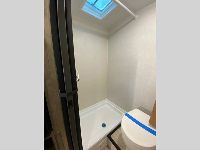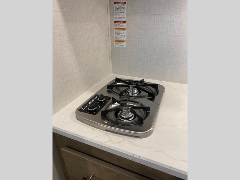 This lightweight travel trailer is perfect for four happy campers. You'll enjoy the front full-size bed, while your guests or little ones take the 28" x 74" bunk beds. There is also a shelf above the bed to keep your things organized. A private bath includes a shower with a toilet so you can freshen up each day without having to leave your camper. You can make your meals on the two burner gas cooktop or in the microwave oven, then take your plate outdoors to eat under the 8' power awning!