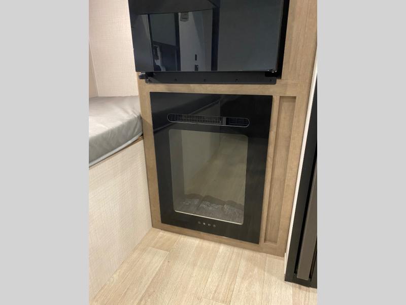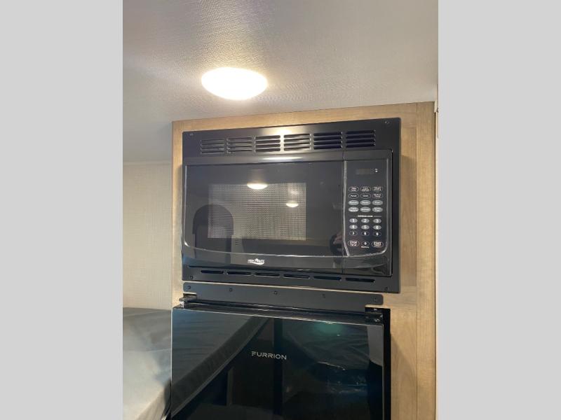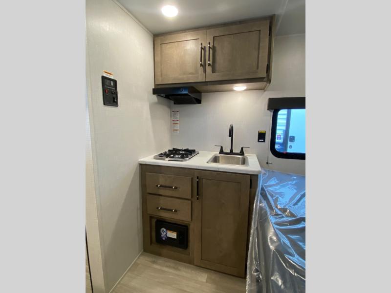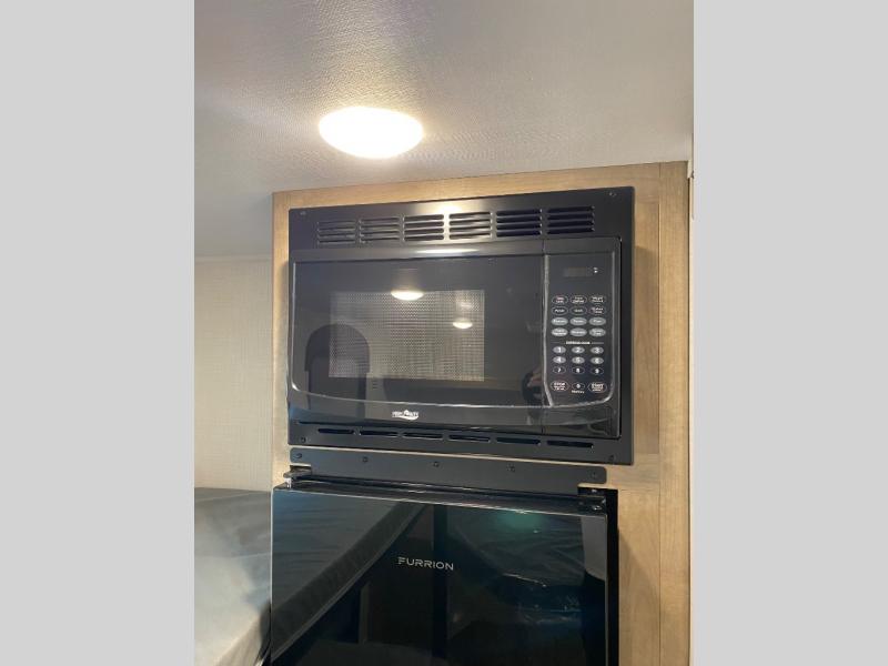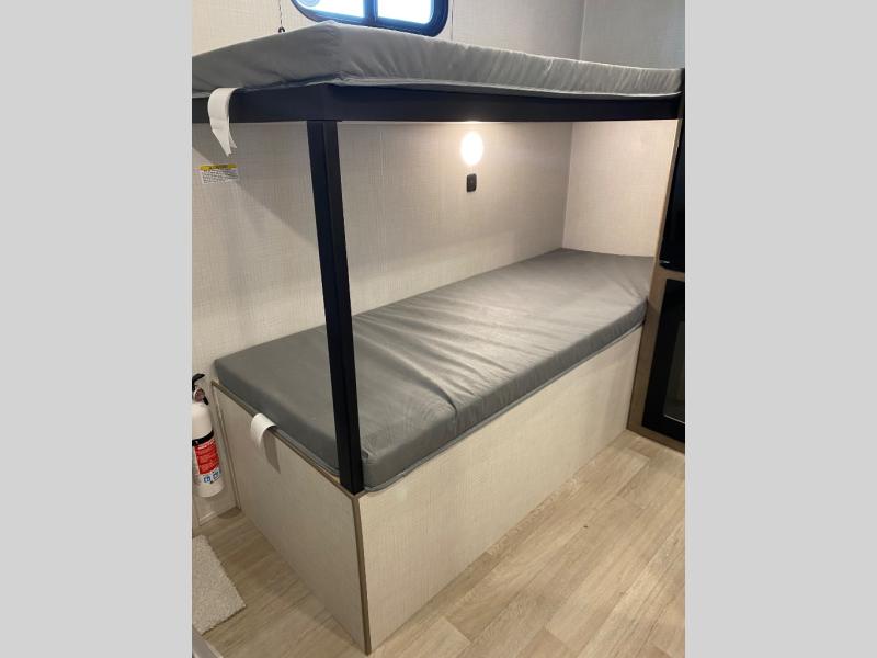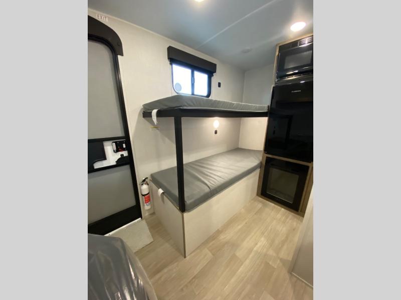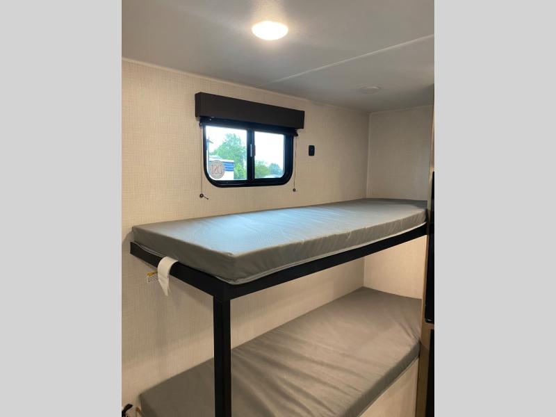 This lightweight travel trailer is perfect for four happy campers. You'll enjoy the front full-size bed, while your guests or little ones take the 28" x 74" bunk beds. There is also a shelf above the bed to keep your things organized. A private bath includes a shower with a toilet so you can freshen up each day without having to leave your camper. You can make your meals on the two burner gas cooktop or in the microwave oven, then take your plate outdoors to eat under the 8' power awning!