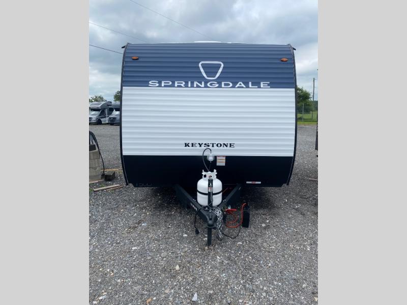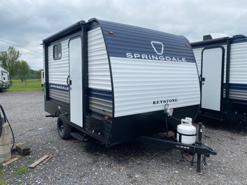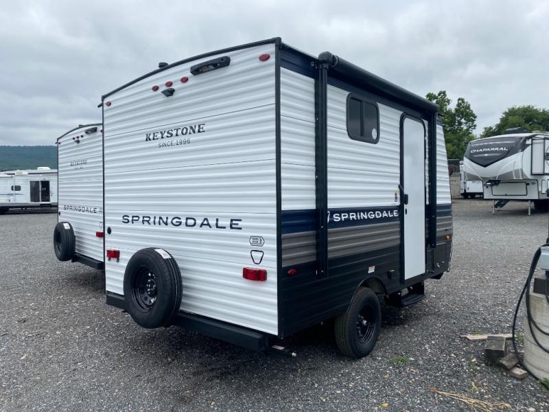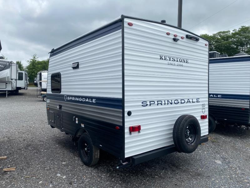 With any Springdale Mini travel trailer by Keystone, you will enjoy lightweight towing thanks to their single-axle! The AlphaPly TPO roof membrane is ultra durable, and the power awning will provide protection from the sun as you relax in your camp chairs outside. Each model includes blackout night shades, LED lighting, plus many more interior comforts. There is also a roof A/C and 20K BTU furnace to keep you comfortable, plus a tankless water heater for endless hot showers!