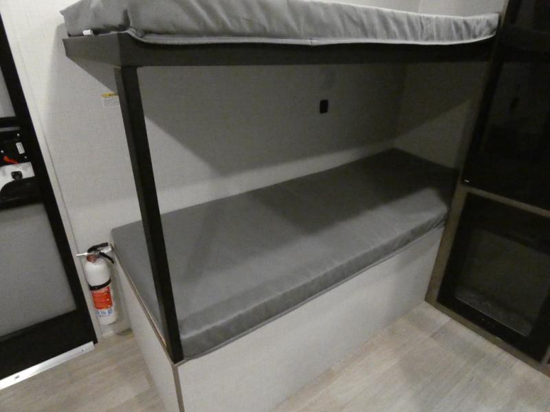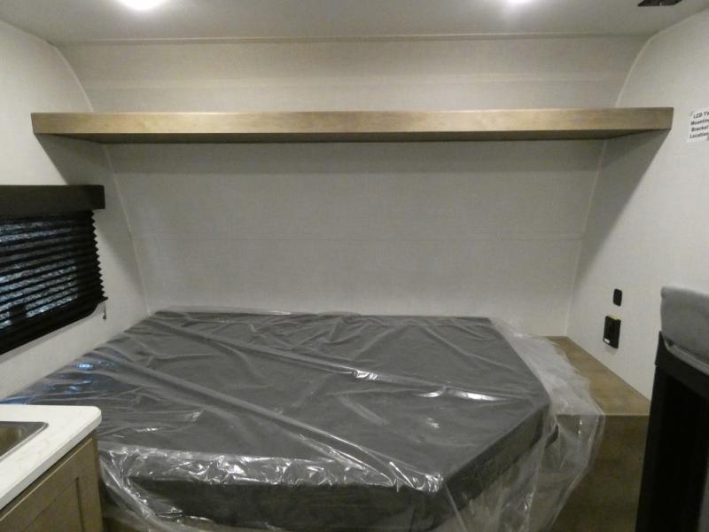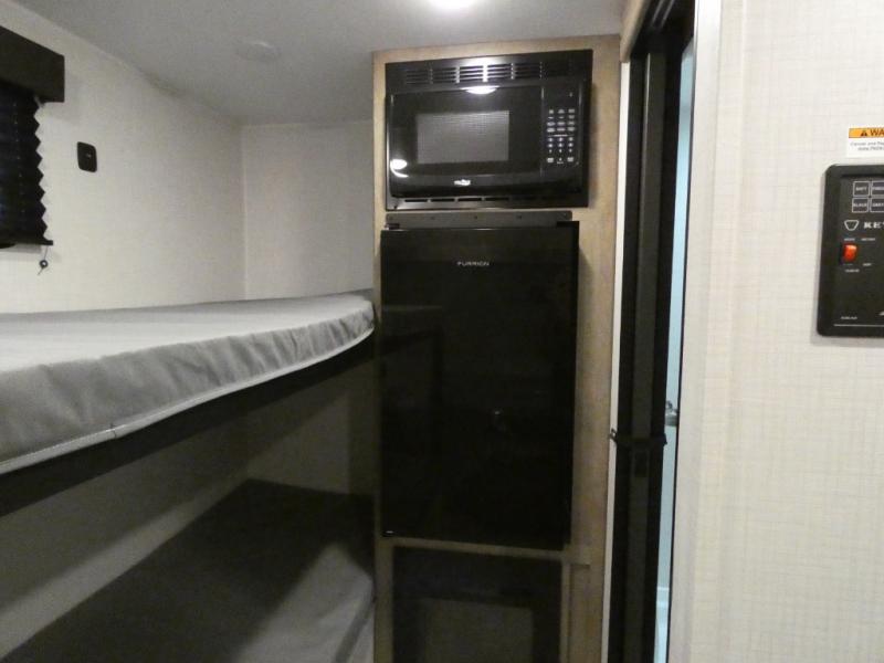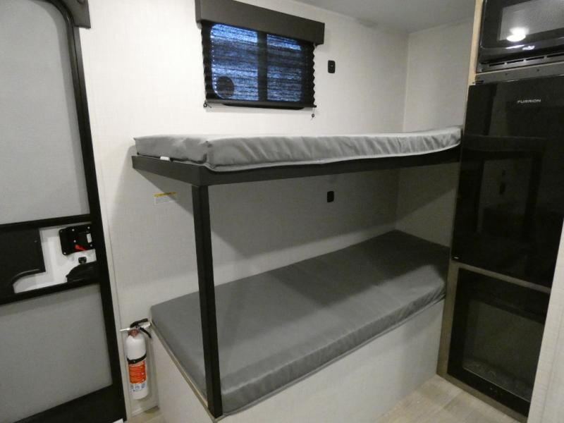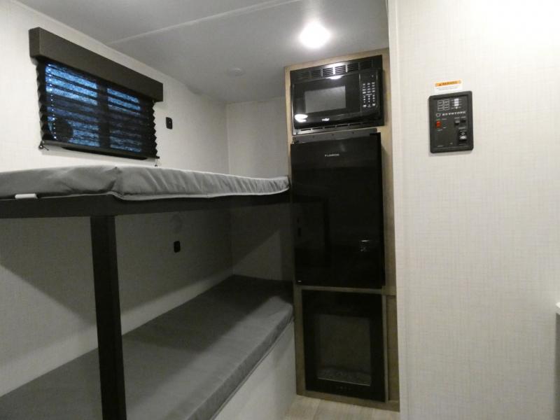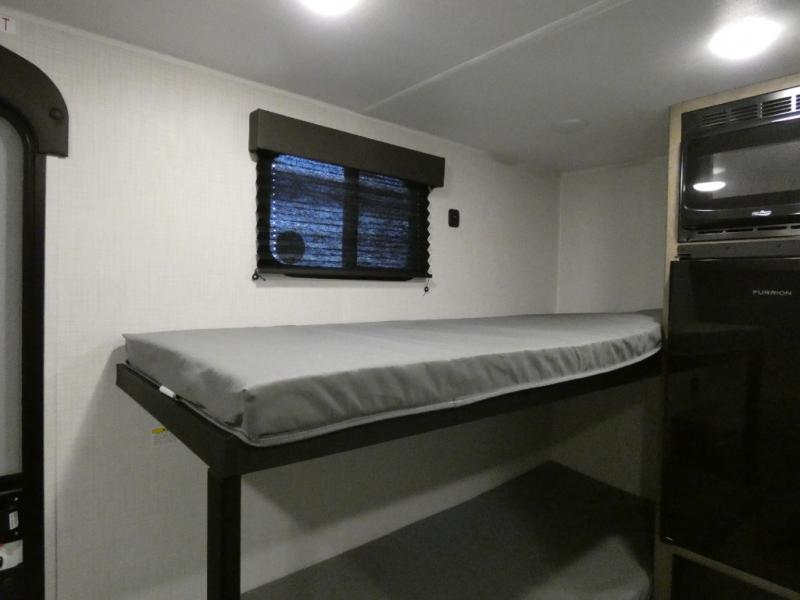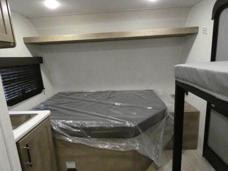 This lightweight travel trailer is perfect for four happy campers. You'll enjoy the front full-size bed, while your guests or little ones take the 28" x 74" bunk beds. There is also a shelf above the bed to keep your things organized. A private bath includes a shower with a toilet so you can freshen up each day without having to leave your camper. You can make your meals on the two burner gas cooktop or in the microwave oven, then take your plate outdoors to eat under the 8' power awning!