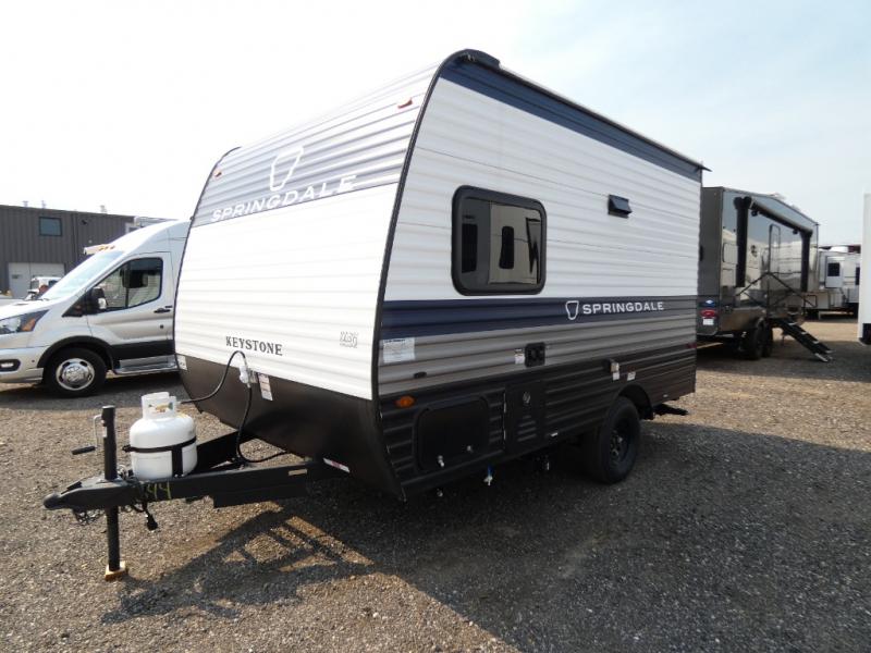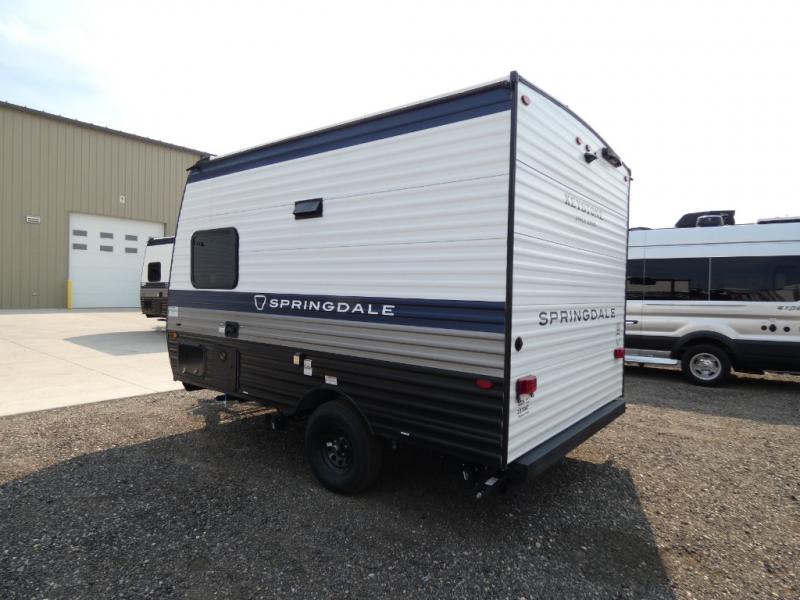 With any Springdale Mini travel trailer by Keystone, you will enjoy lightweight towing thanks to their single-axle! The AlphaPly TPO roof membrane is ultra durable, and the power awning will provide protection from the sun as you relax in your camp chairs outside. Each model includes blackout night shades, LED lighting, plus many more interior comforts. There is also a roof A/C and 20K BTU furnace to keep you comfortable, plus a tankless water heater for endless hot showers!