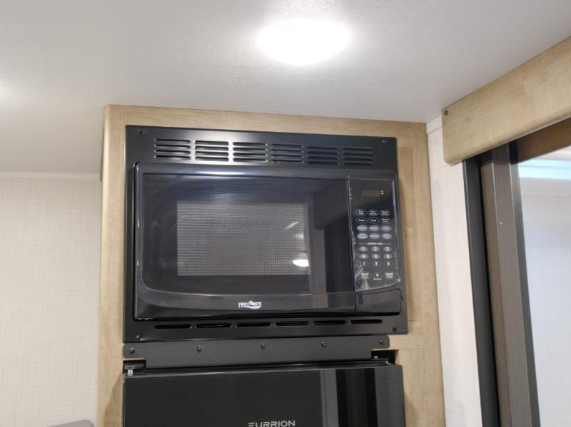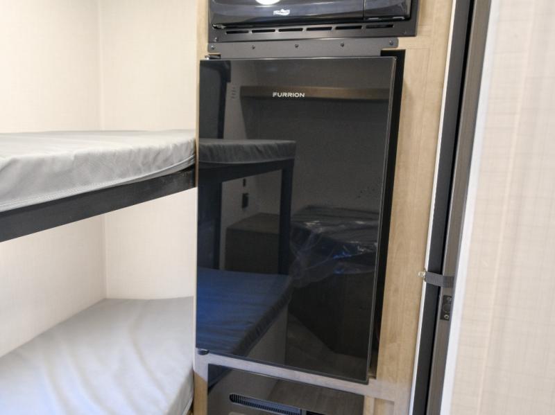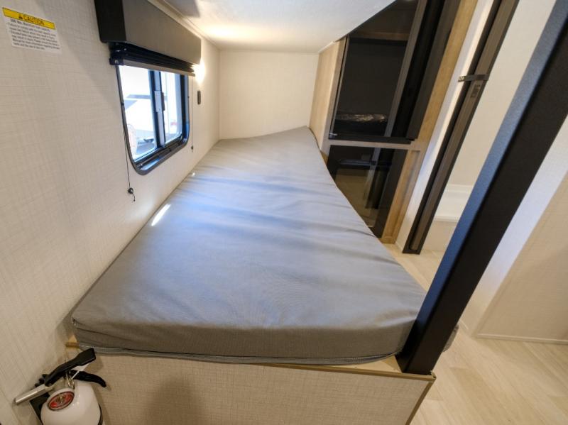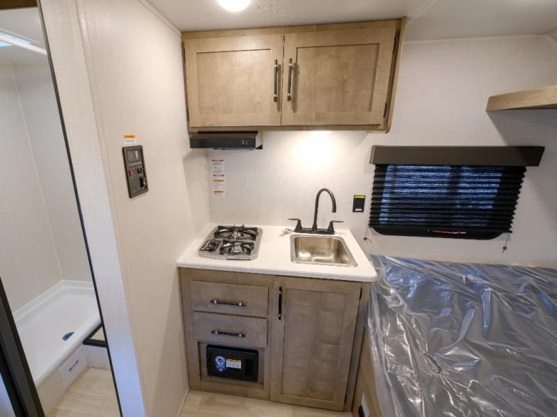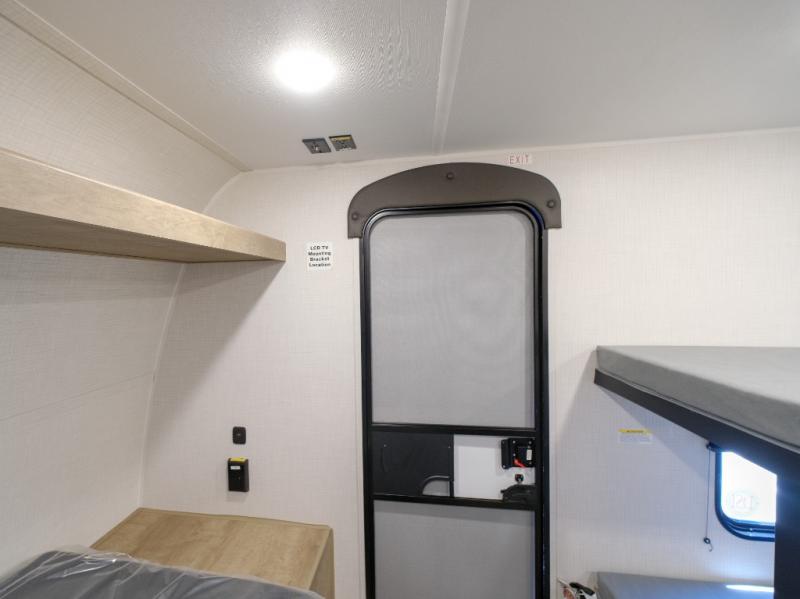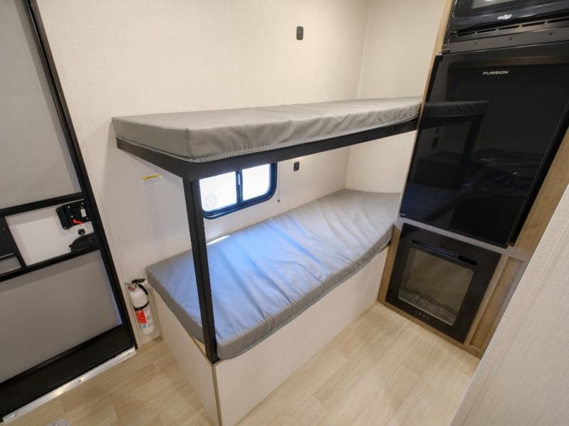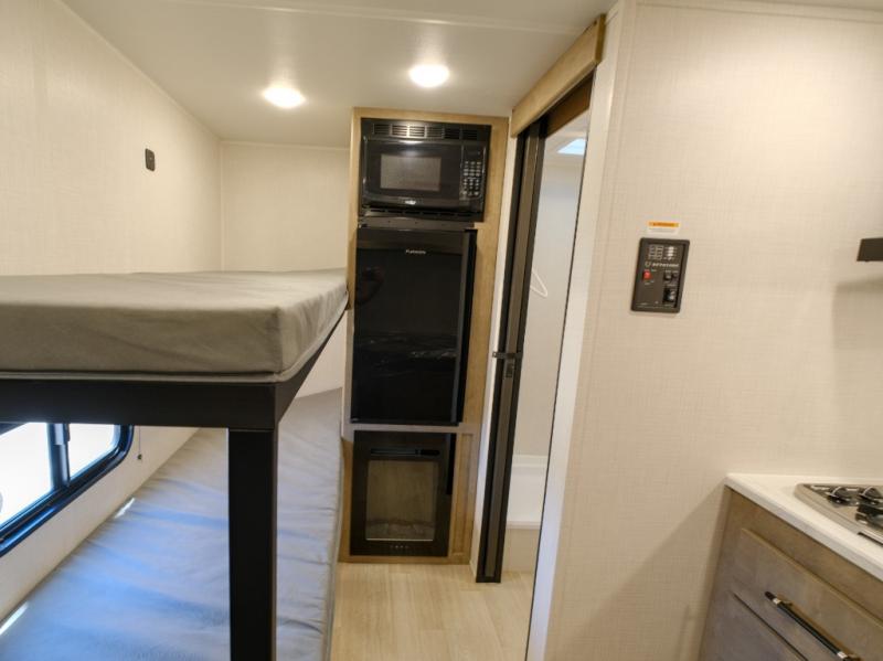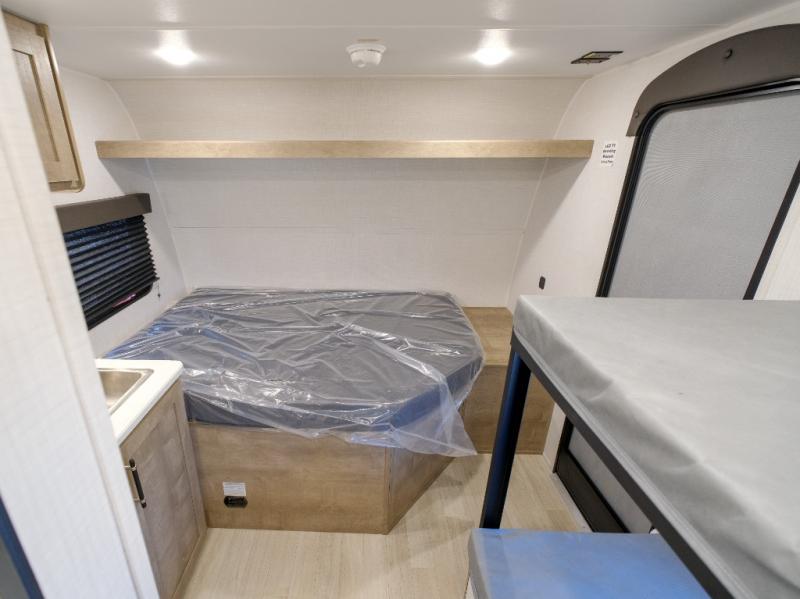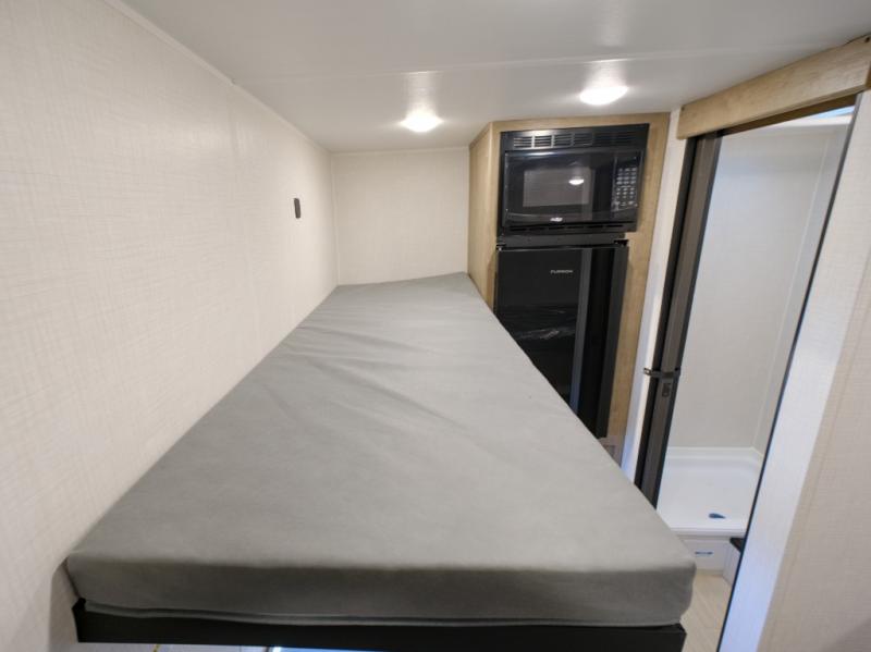 This lightweight travel trailer is perfect for four happy campers. You'll enjoy the front full-size bed, while your guests or little ones take the 28" x 74" bunk beds. There is also a shelf above the bed to keep your things organized. A private bath includes a shower with a toilet so you can freshen up each day without having to leave your camper. You can make your meals on the two burner gas cooktop or in the microwave oven, then take your plate outdoors to eat under the 8' power awning!