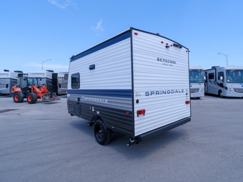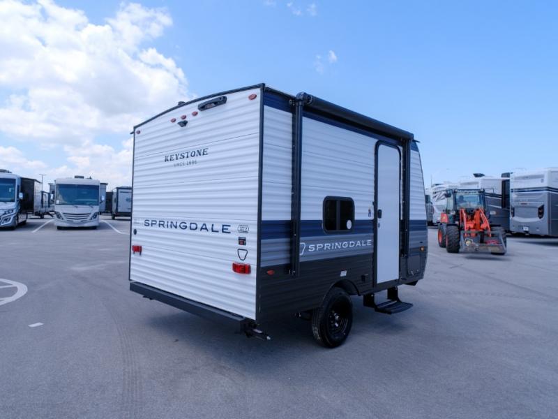 With any Springdale Mini travel trailer by Keystone, you will enjoy lightweight towing thanks to their single-axle! The AlphaPly TPO roof membrane is ultra durable, and the power awning will provide protection from the sun as you relax in your camp chairs outside. Each model includes blackout night shades, LED lighting, plus many more interior comforts. There is also a roof A/C and 20K BTU furnace to keep you comfortable, plus a tankless water heater for endless hot showers!