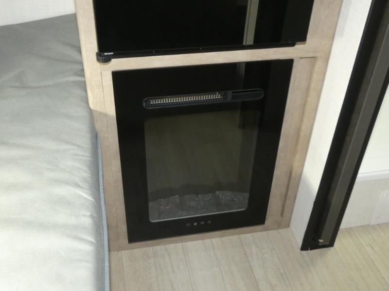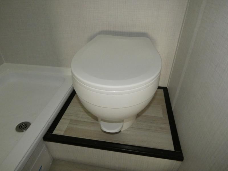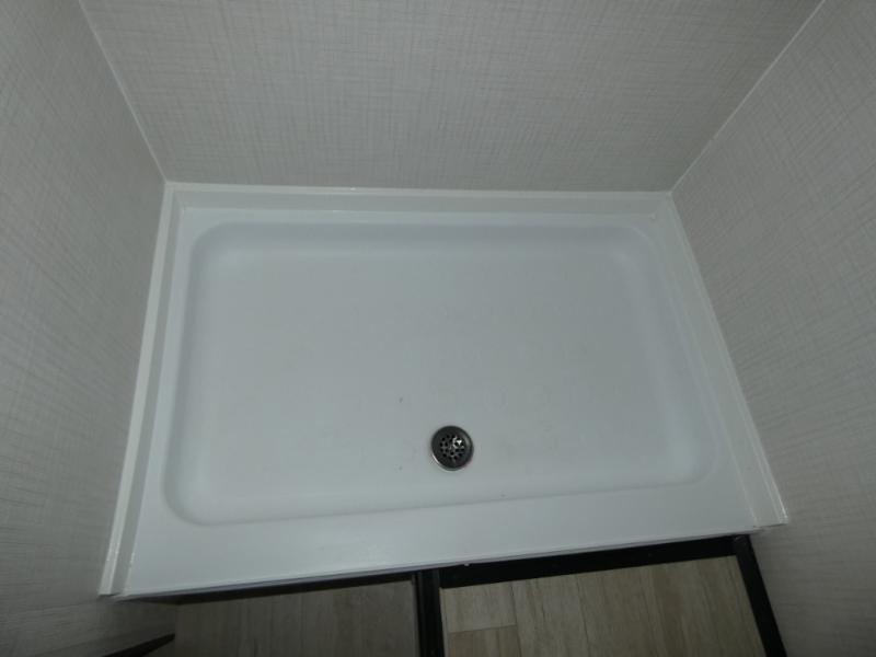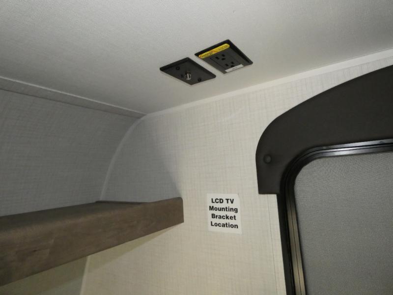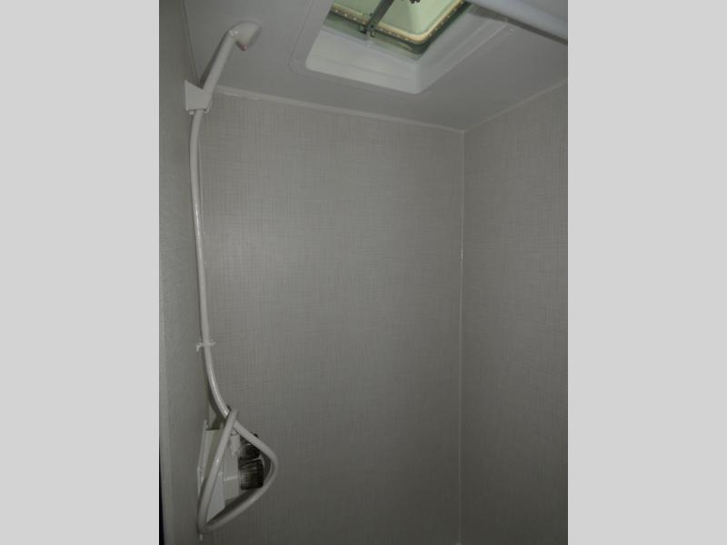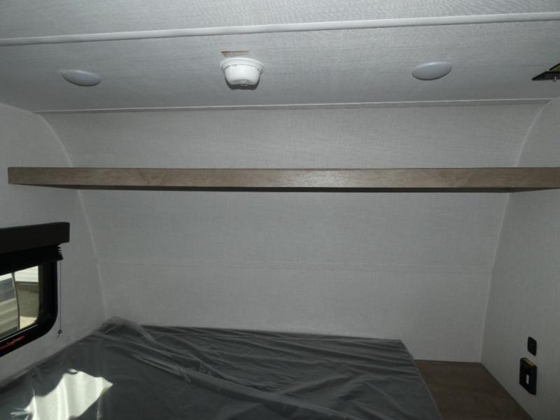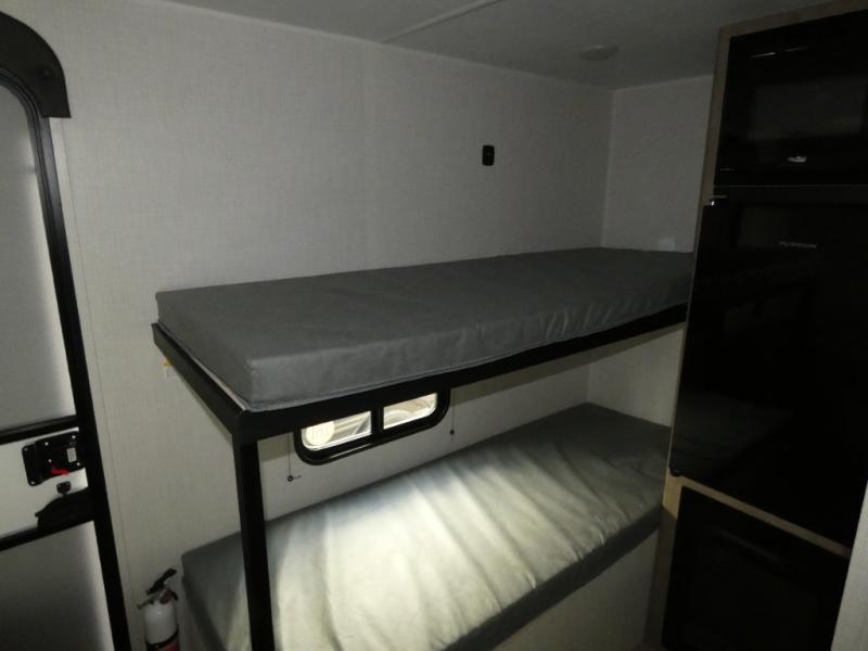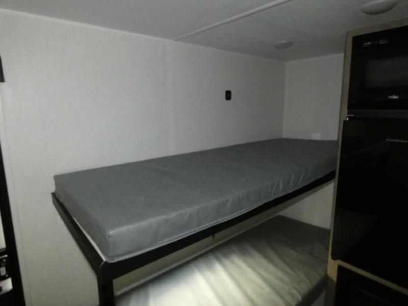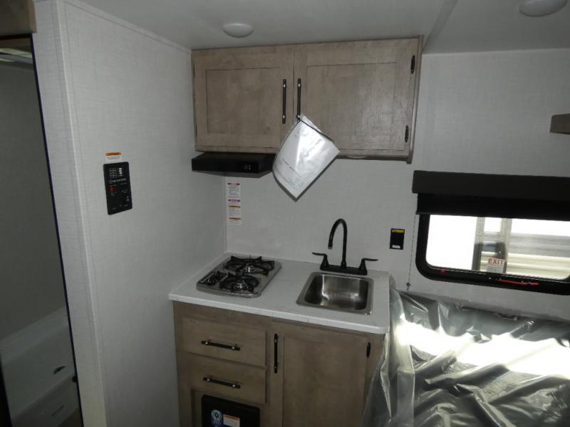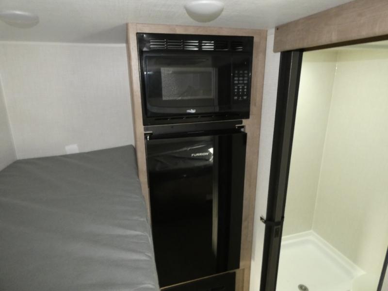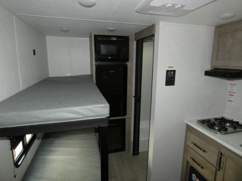 This lightweight travel trailer is perfect for four happy campers. You'll enjoy the front full-size bed, while your guests or little ones take the 28" x 74" bunk beds. There is also a shelf above the bed to keep your things organized. A private bath includes a shower with a toilet so you can freshen up each day without having to leave your camper. You can make your meals on the two burner gas cooktop or in the microwave oven, then take your plate outdoors to eat under the 8' power awning!