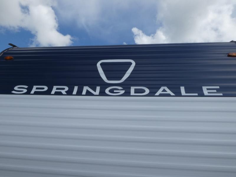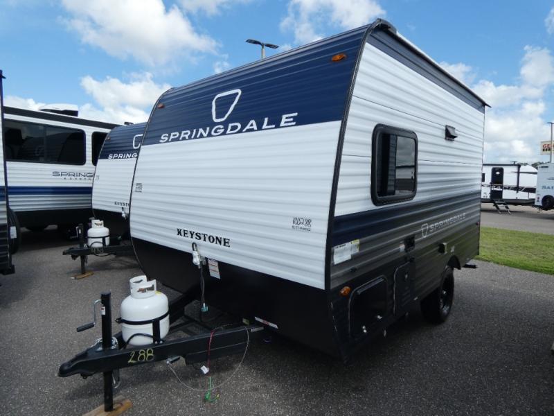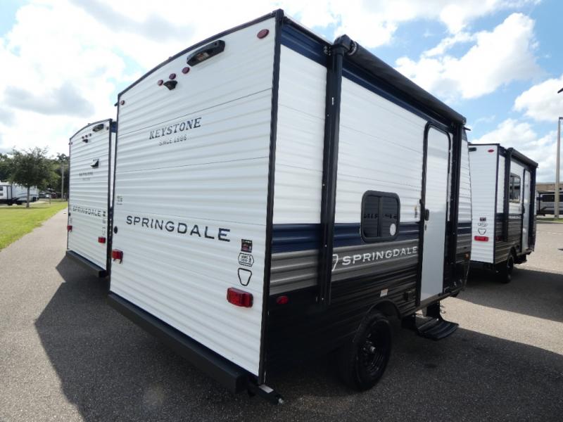 With any Springdale Mini travel trailer by Keystone, you will enjoy lightweight towing thanks to their single-axle! The AlphaPly TPO roof membrane is ultra durable, and the power awning will provide protection from the sun as you relax in your camp chairs outside. Each model includes blackout night shades, LED lighting, plus many more interior comforts. There is also a roof A/C and 20K BTU furnace to keep you comfortable, plus a tankless water heater for endless hot showers!