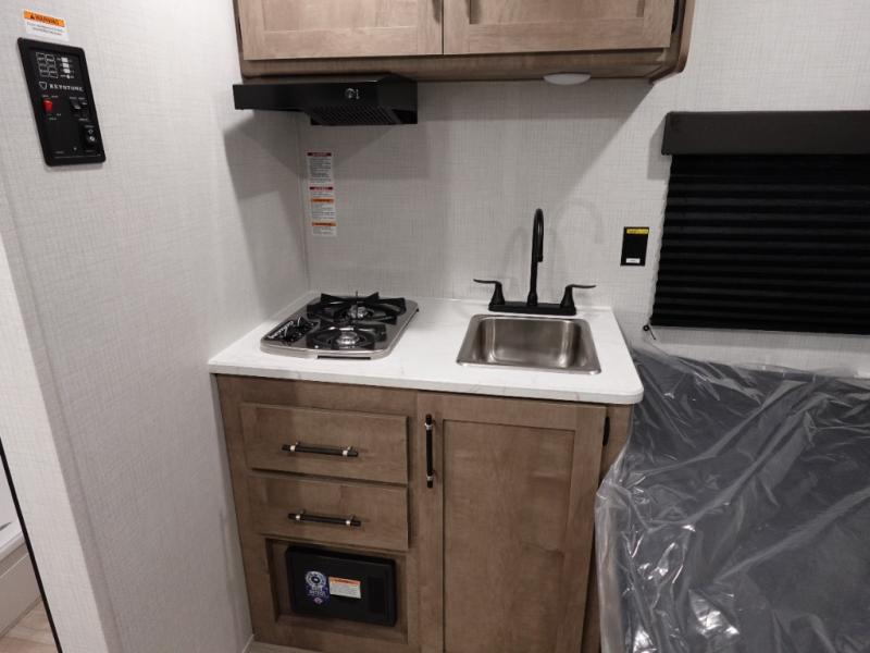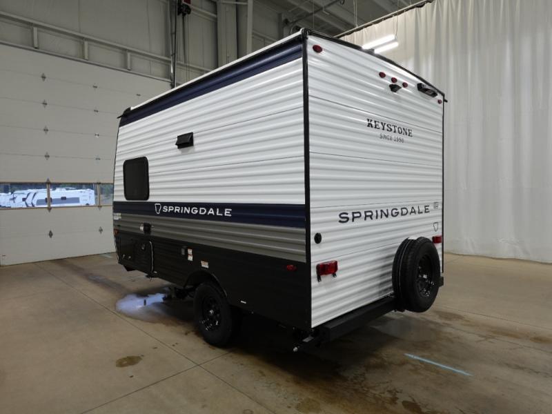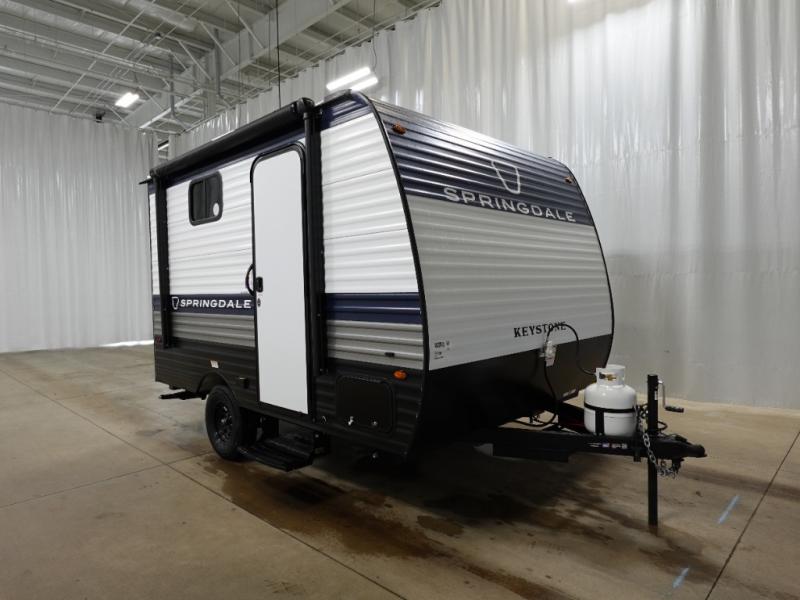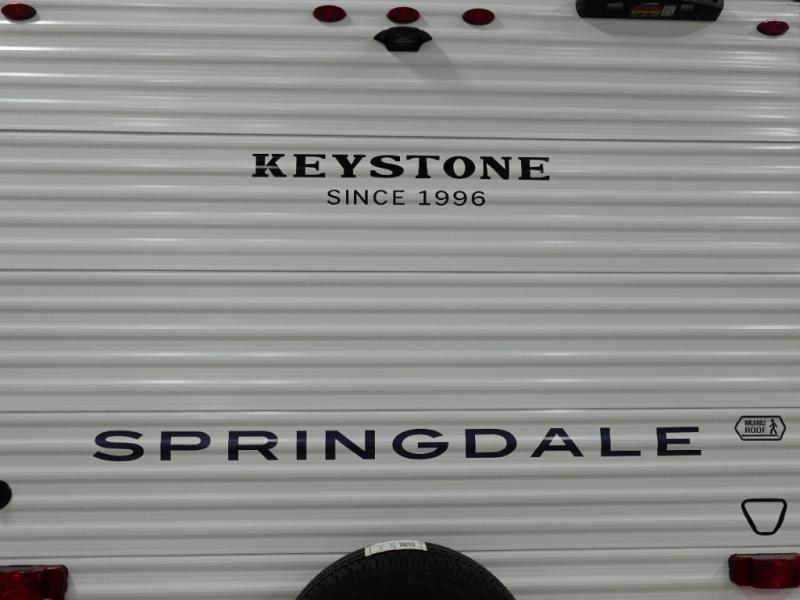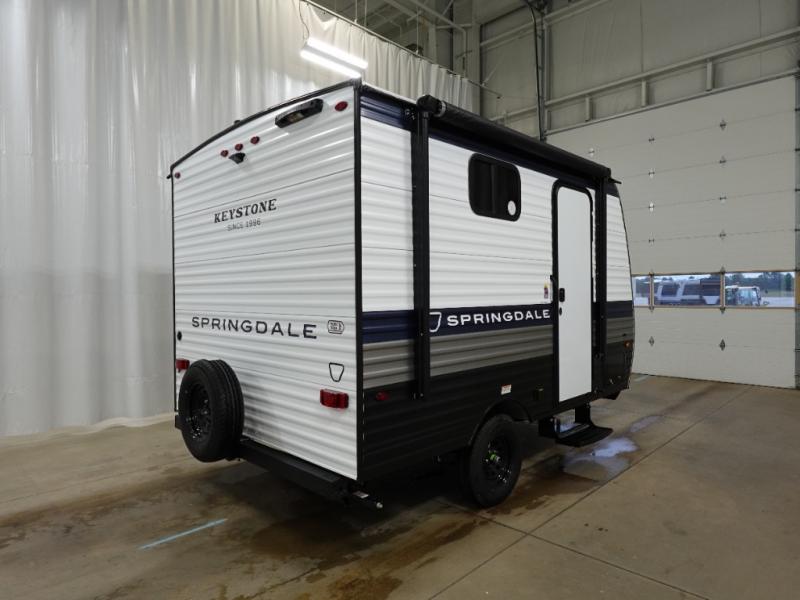 With any Springdale Mini travel trailer by Keystone, you will enjoy lightweight towing thanks to their single-axle! The AlphaPly TPO roof membrane is ultra durable, and the power awning will provide protection from the sun as you relax in your camp chairs outside. Each model includes blackout night shades, LED lighting, plus many more interior comforts. There is also a roof A/C and 20K BTU furnace to keep you comfortable, plus a tankless water heater for endless hot showers!