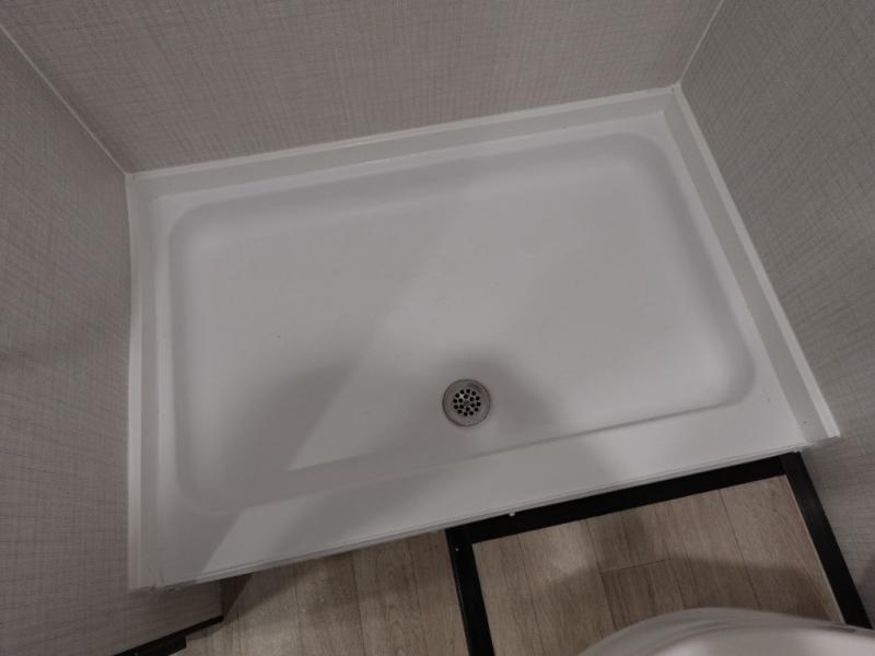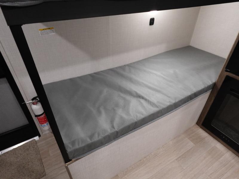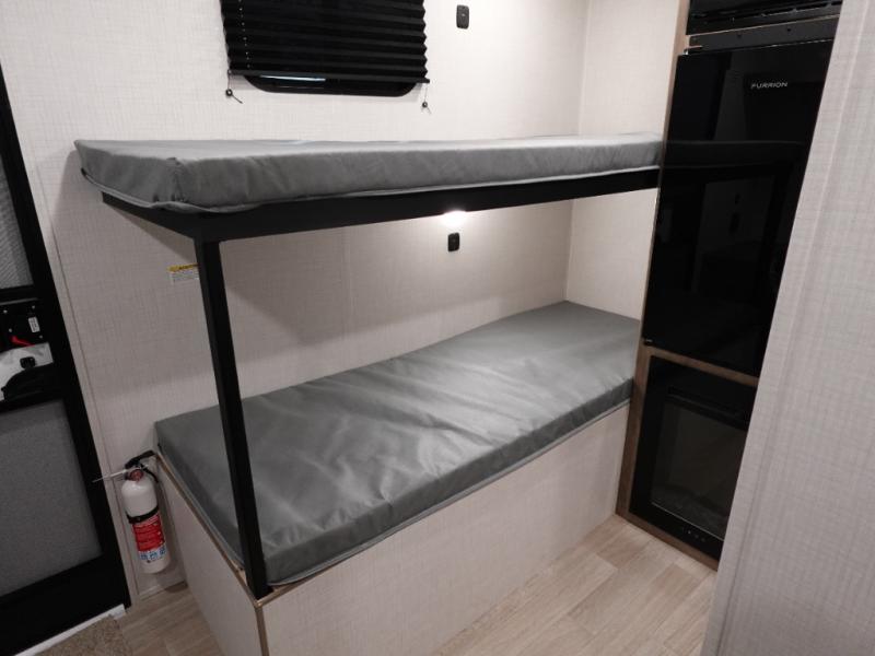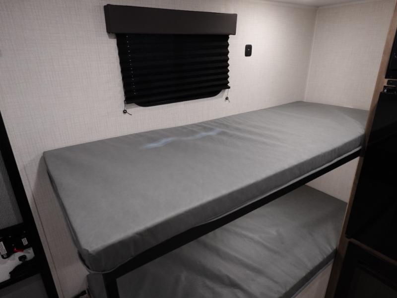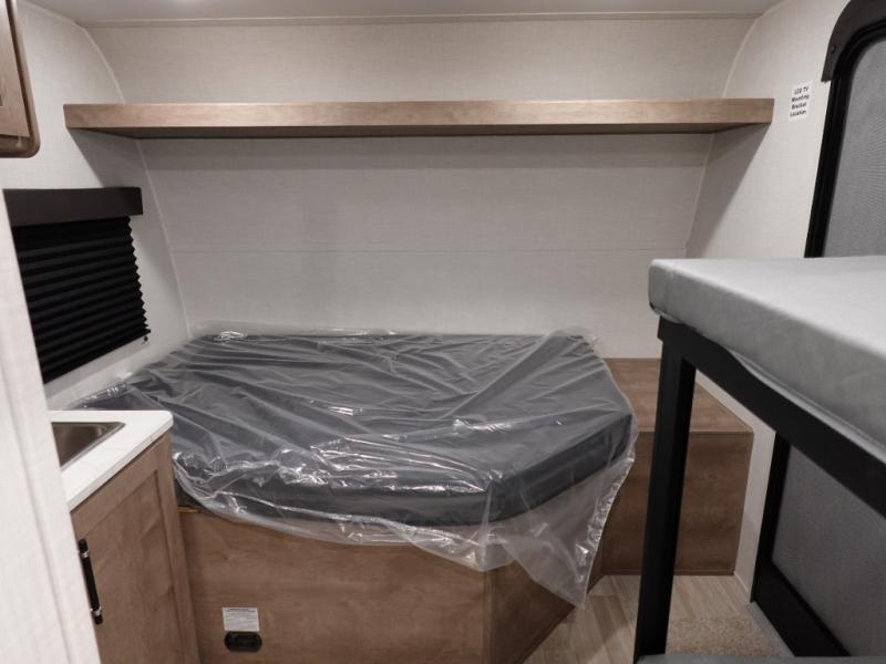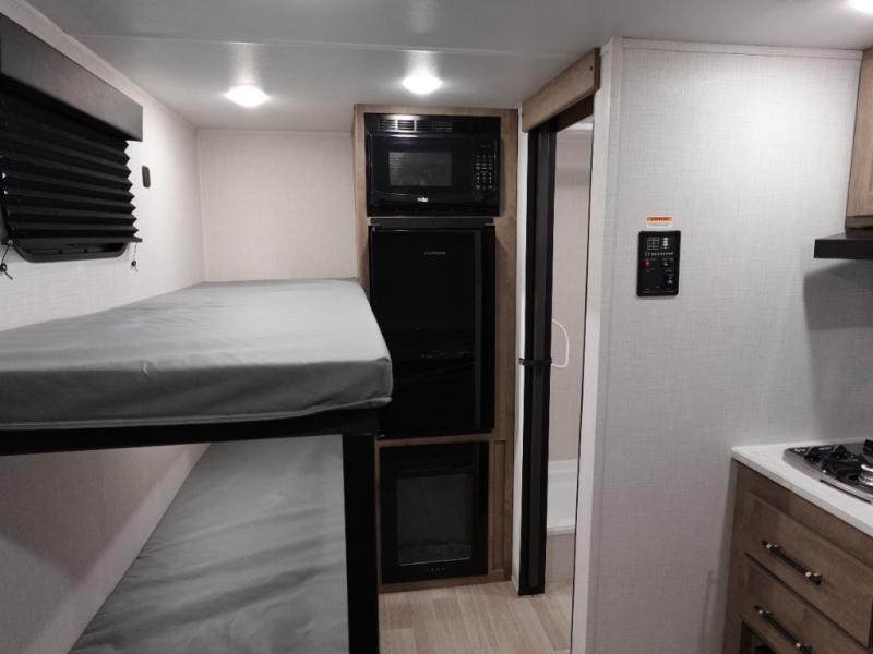 This lightweight travel trailer is perfect for four happy campers. You'll enjoy the front full-size bed, while your guests or little ones take the 28" x 74" bunk beds. There is also a shelf above the bed to keep your things organized. A private bath includes a shower with a toilet so you can freshen up each day without having to leave your camper. You can make your meals on the two burner gas cooktop or in the microwave oven, then take your plate outdoors to eat under the 8' power awning!
