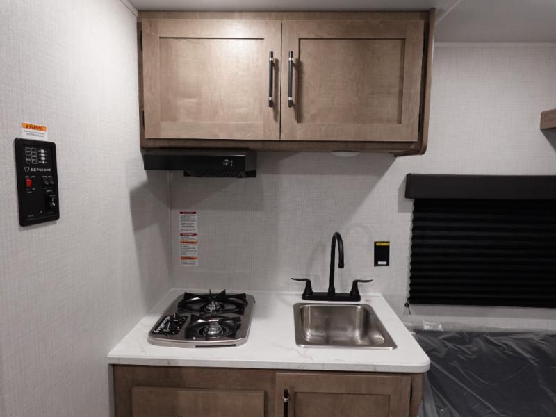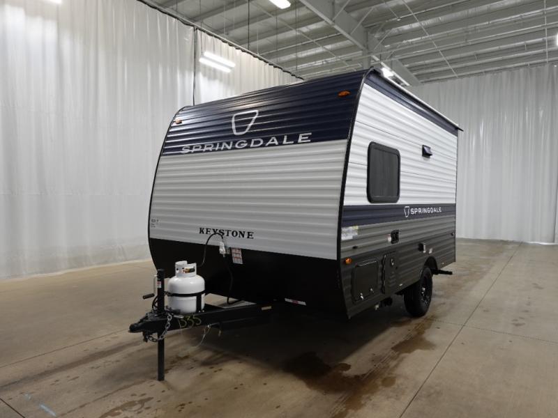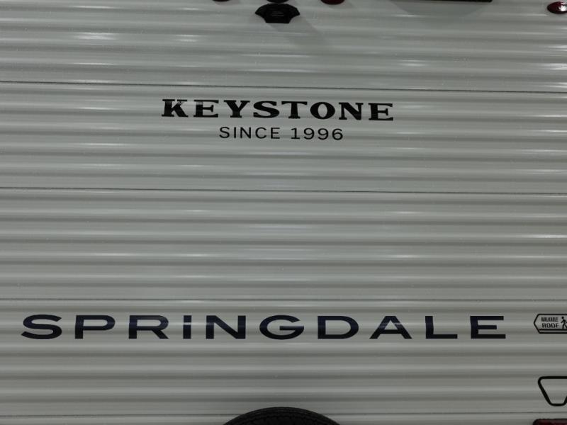 With any Springdale Mini travel trailer by Keystone, you will enjoy lightweight towing thanks to their single-axle! The AlphaPly TPO roof membrane is ultra durable, and the power awning will provide protection from the sun as you relax in your camp chairs outside. Each model includes blackout night shades, LED lighting, plus many more interior comforts. There is also a roof A/C and 20K BTU furnace to keep you comfortable, plus a tankless water heater for endless hot showers!